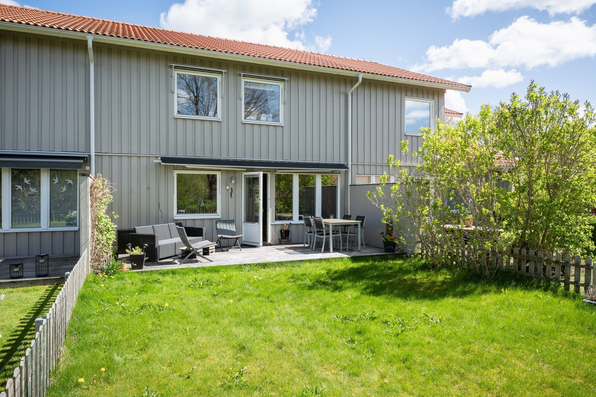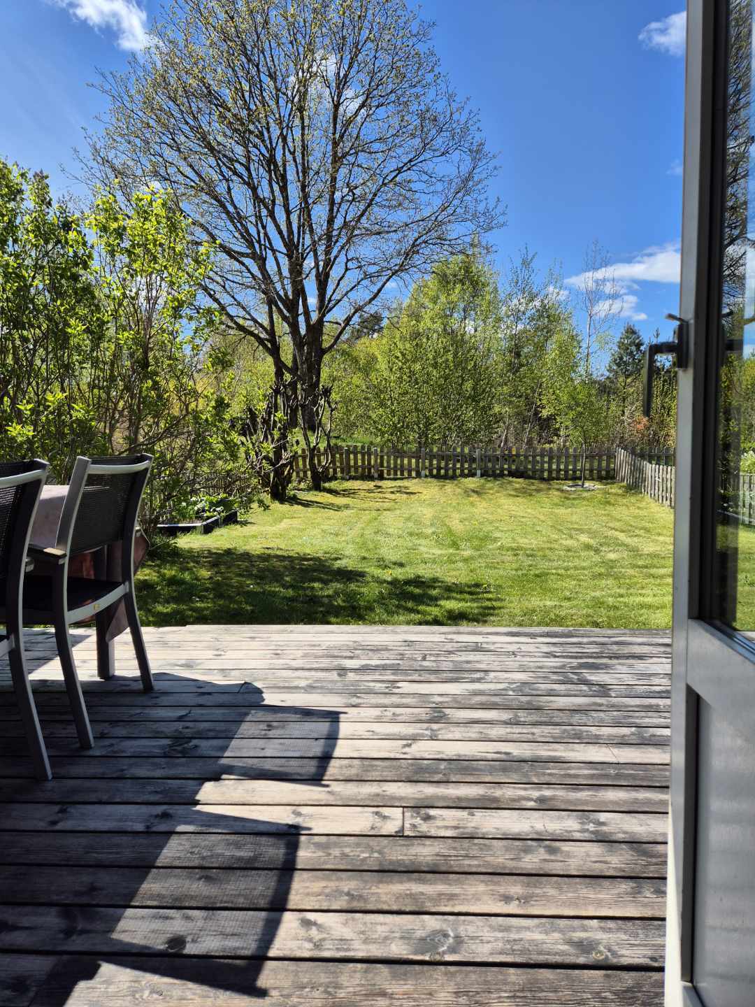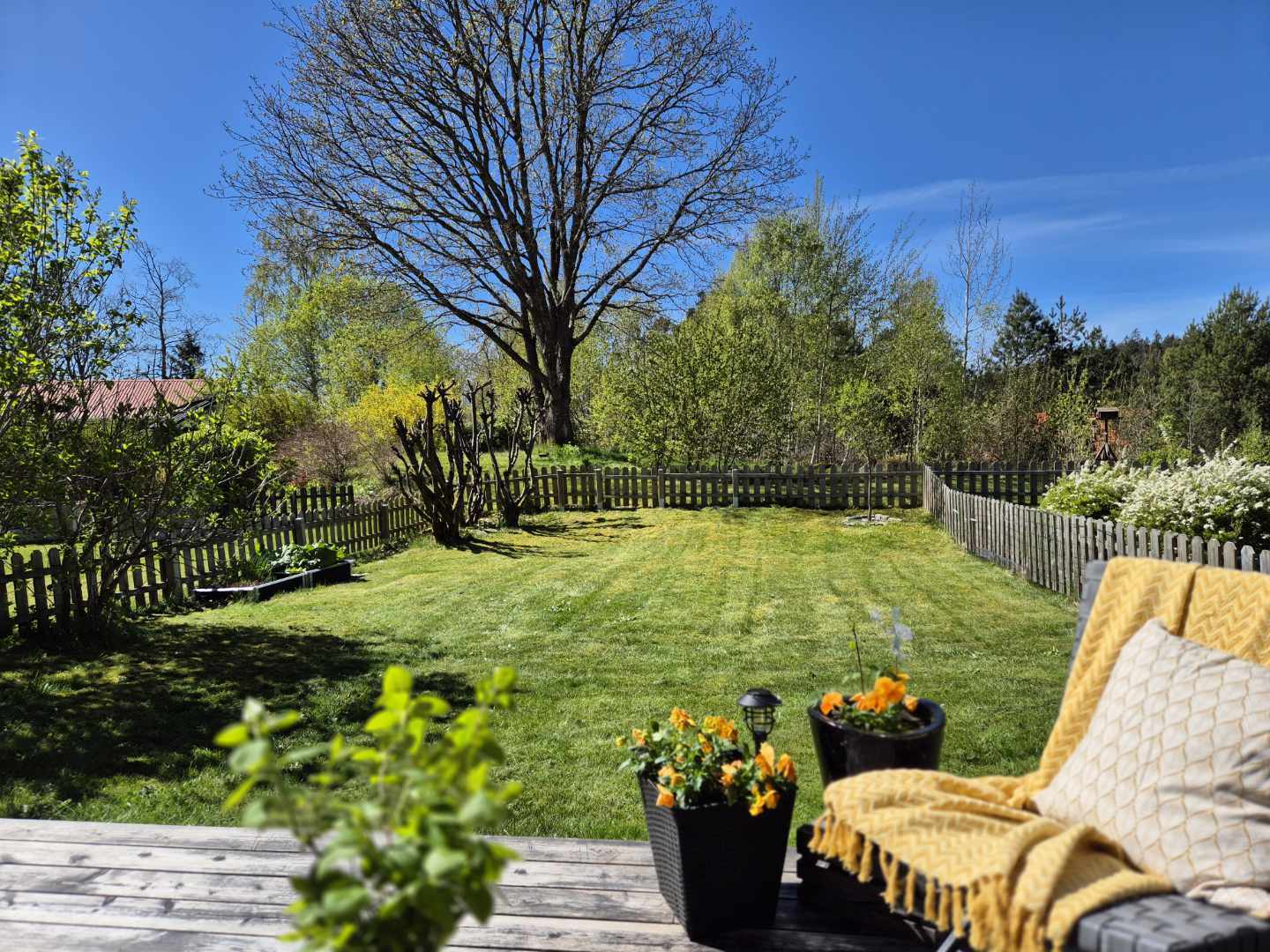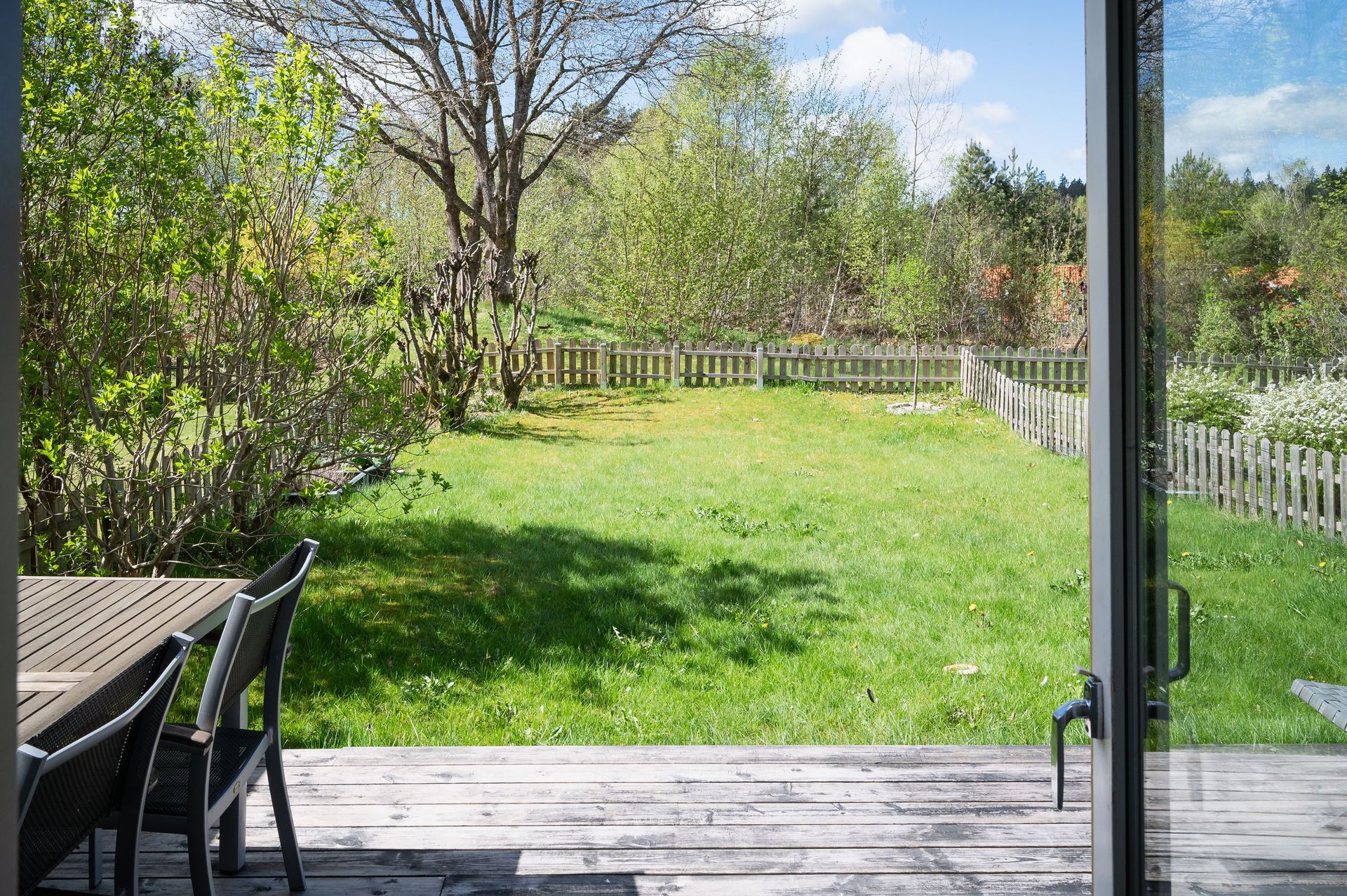 Trivsam trädgård med gräns mot grönområde och soligt läge hela dagen.