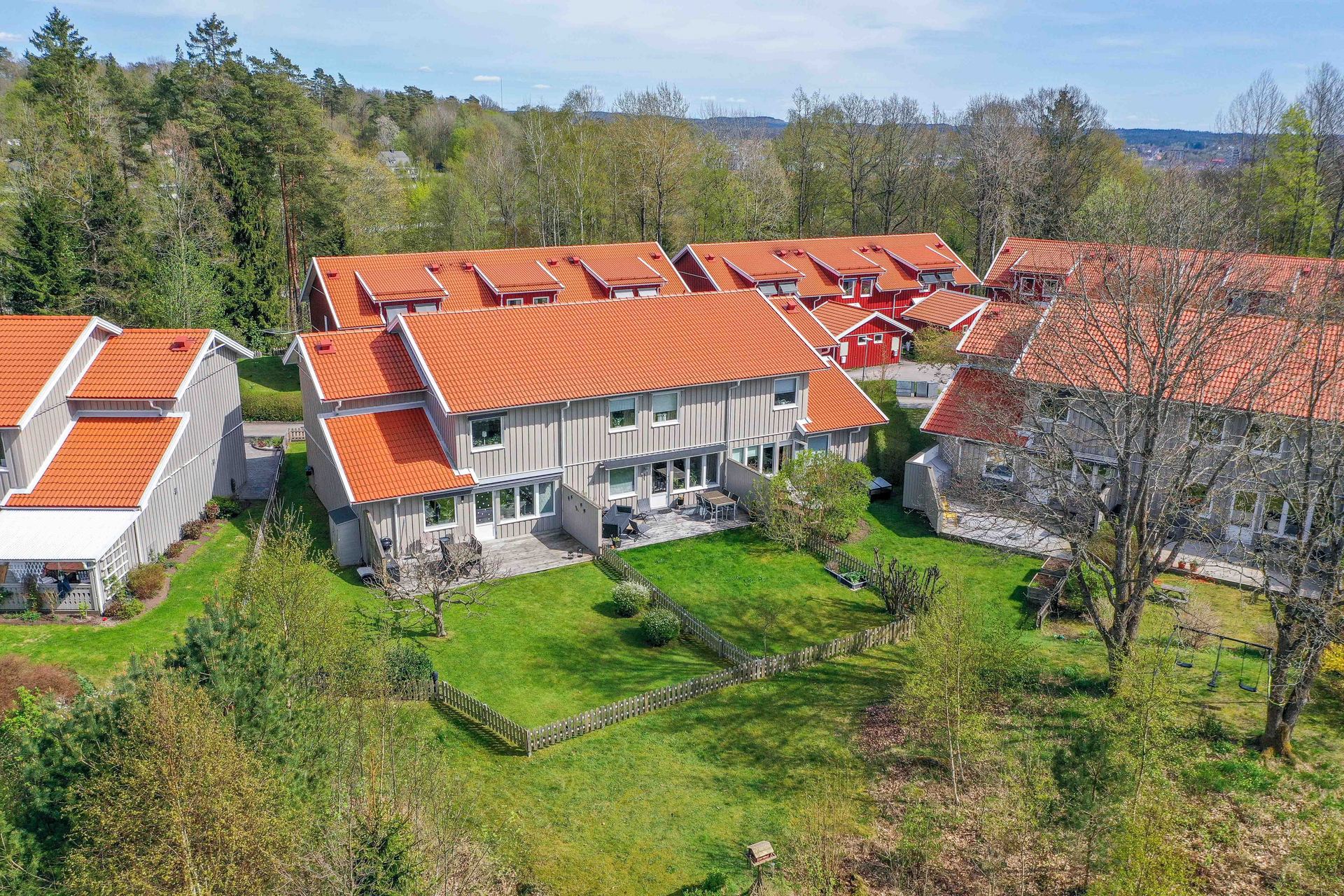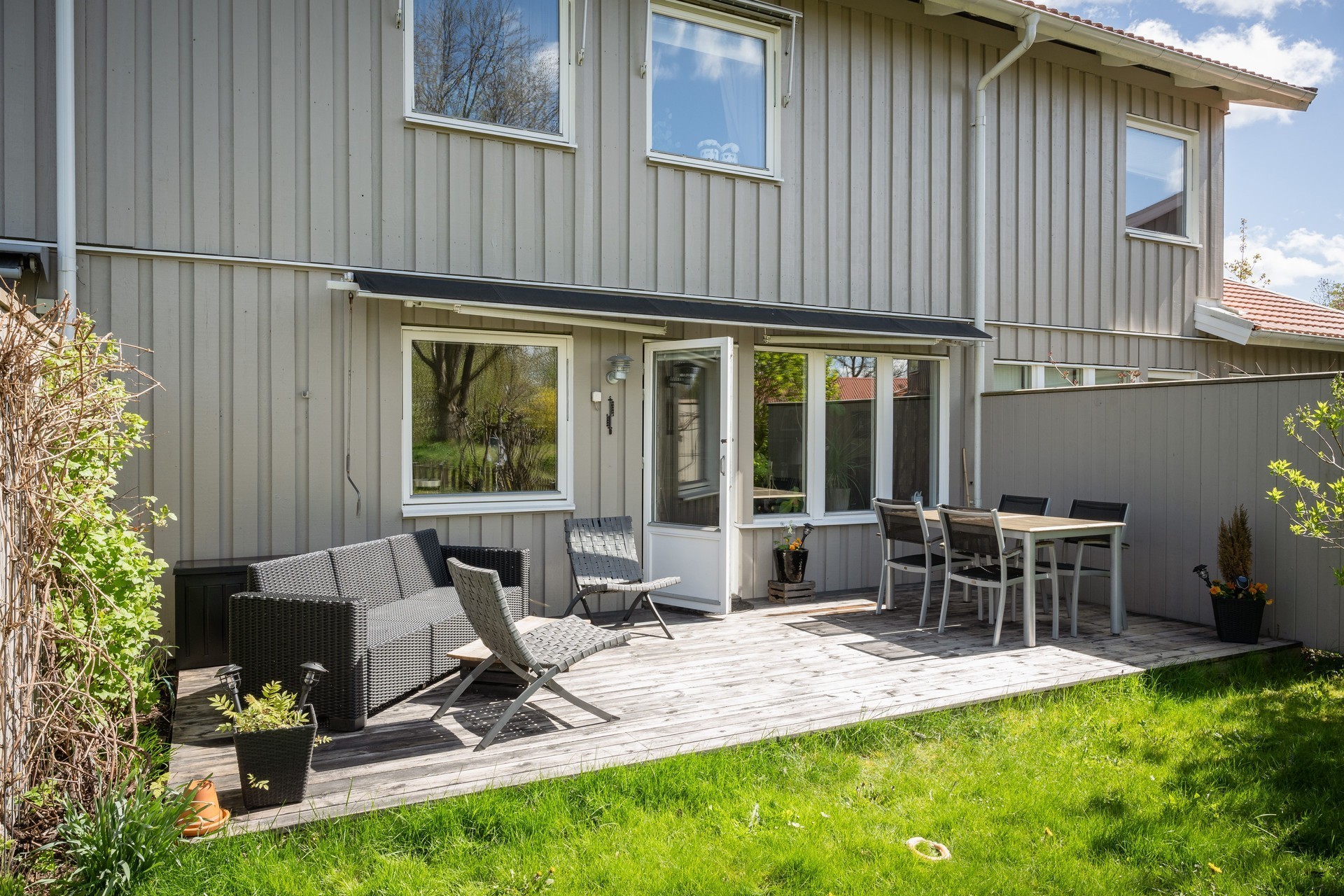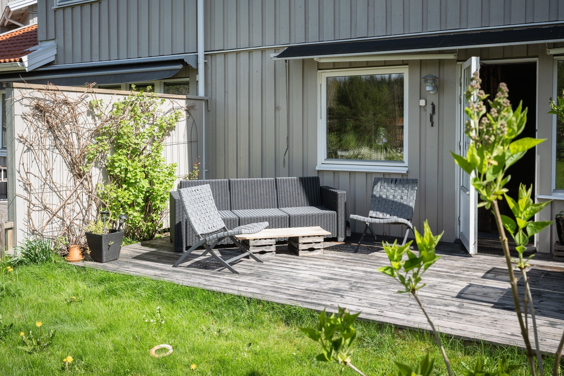 Trivsam trädgård med gräns mot grönområde och soligt läge hela dagen.
