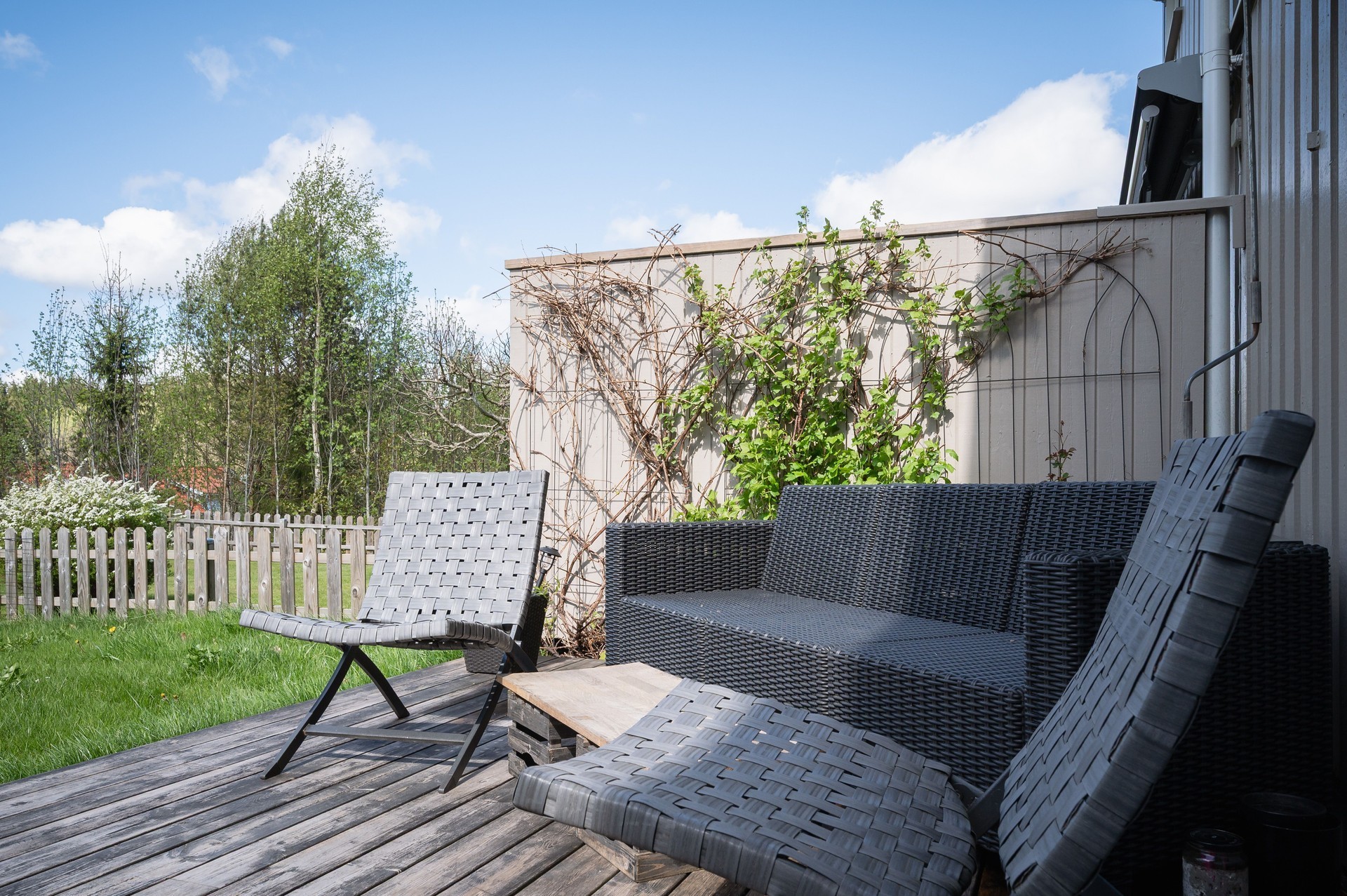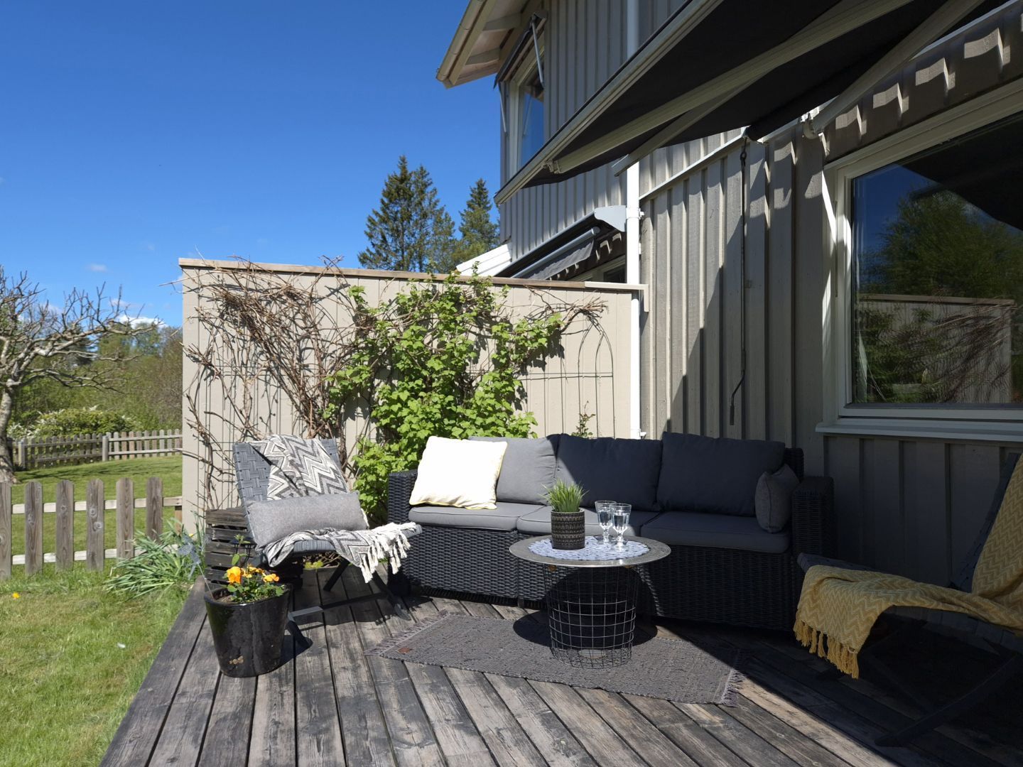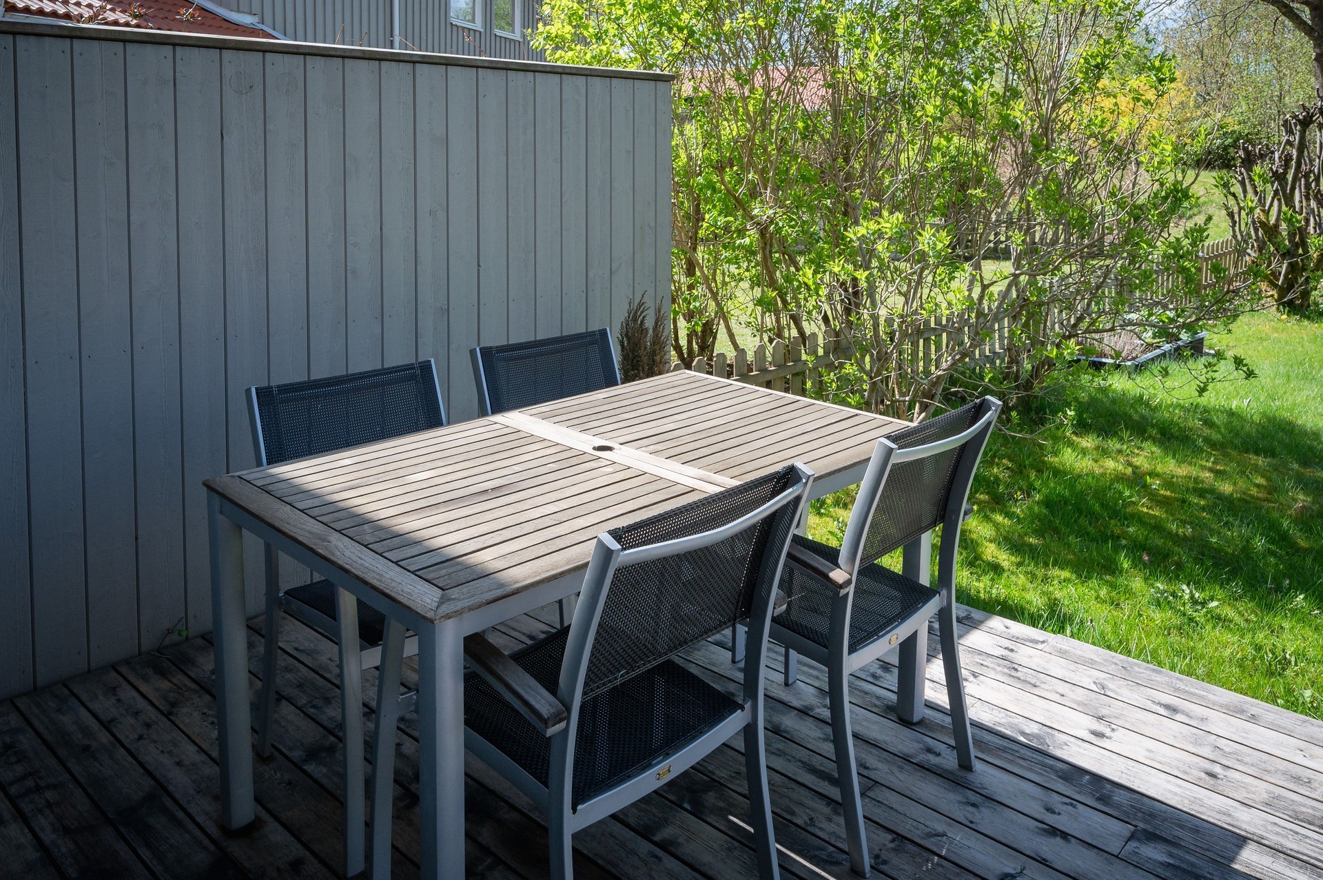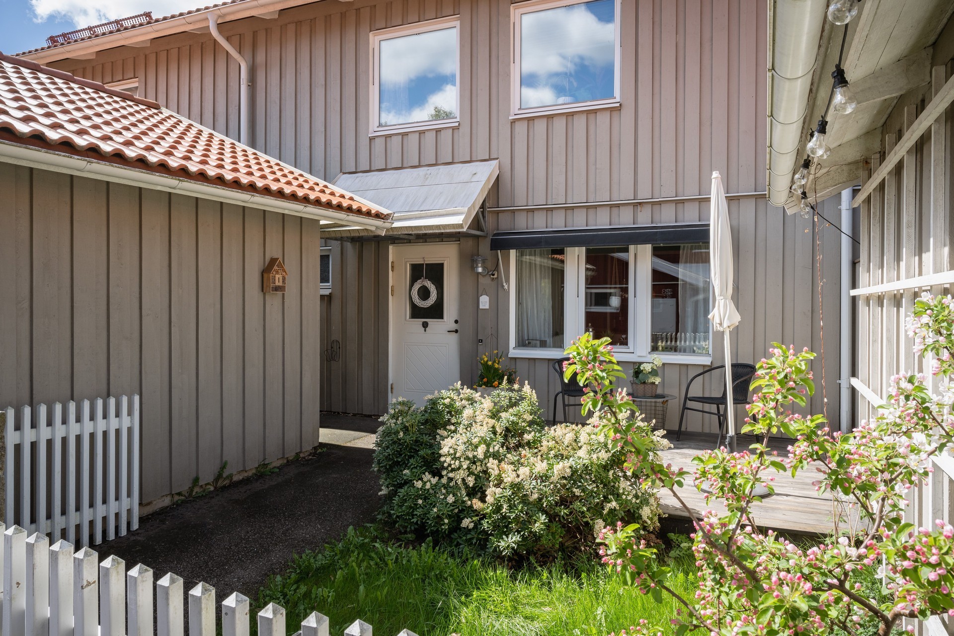 Trivsam trädgård med gräns mot grönområde och soligt läge hela dagen.