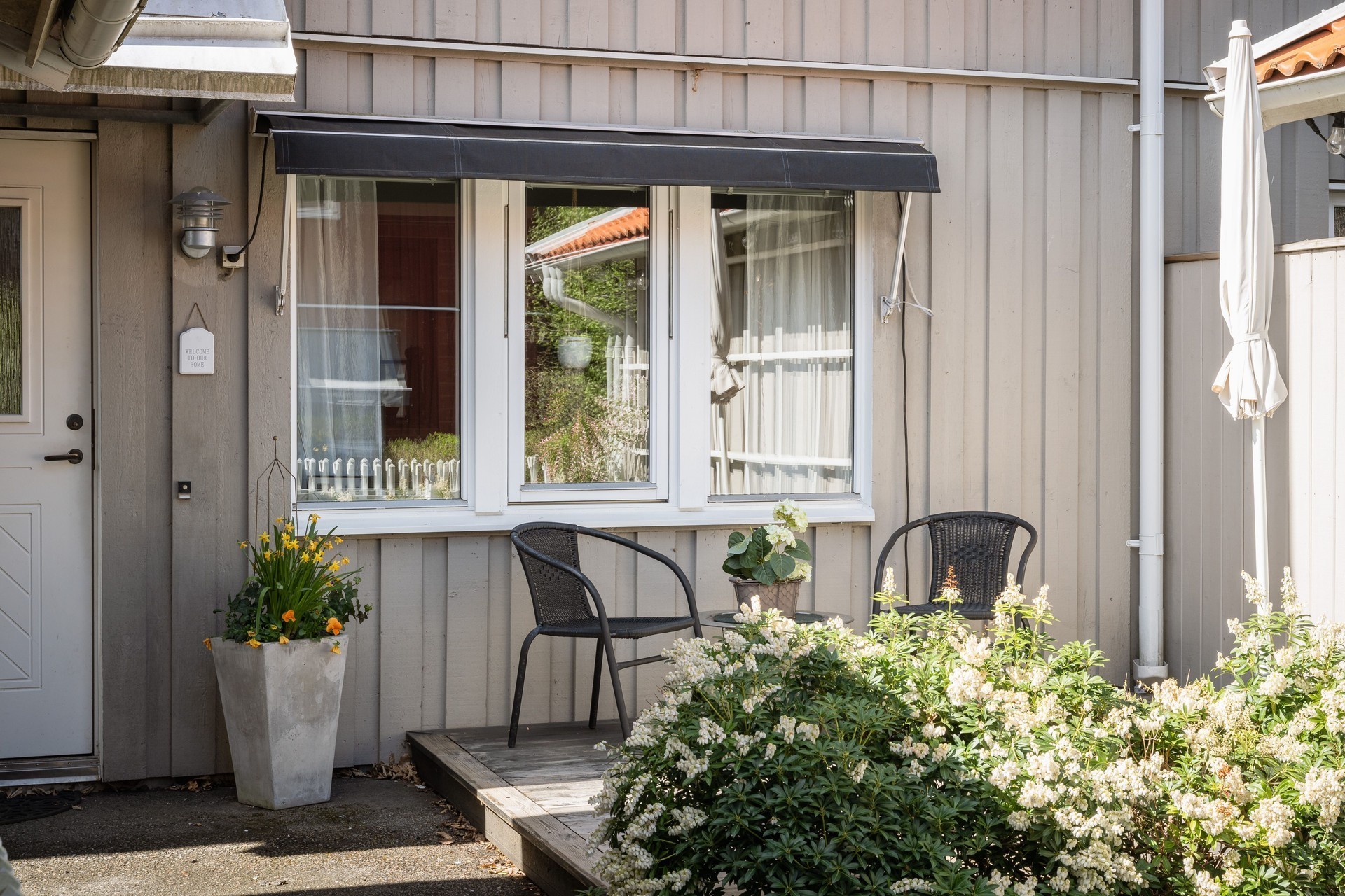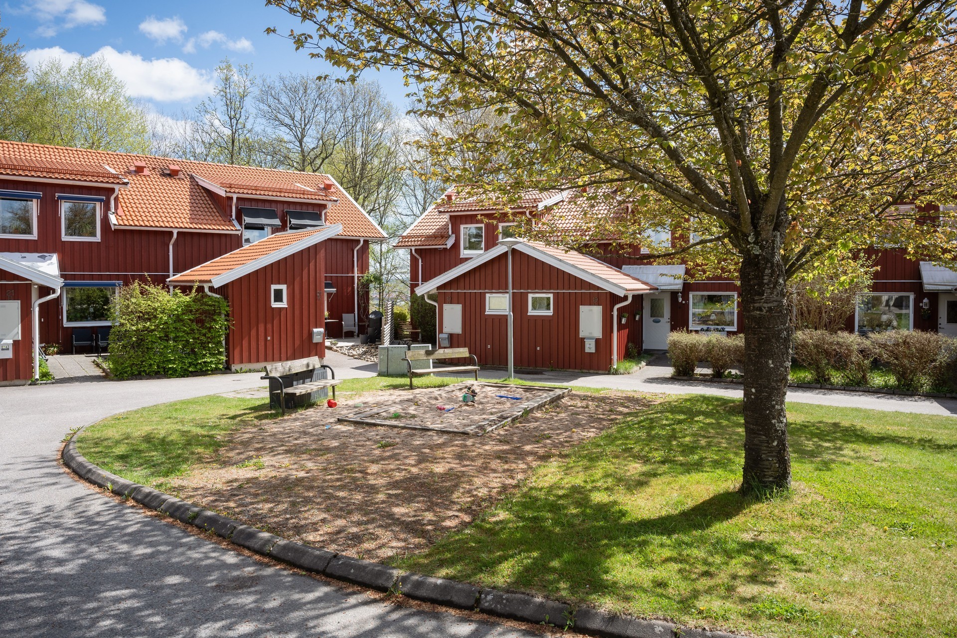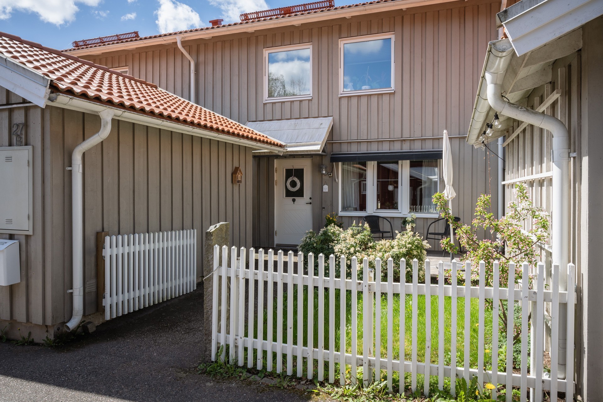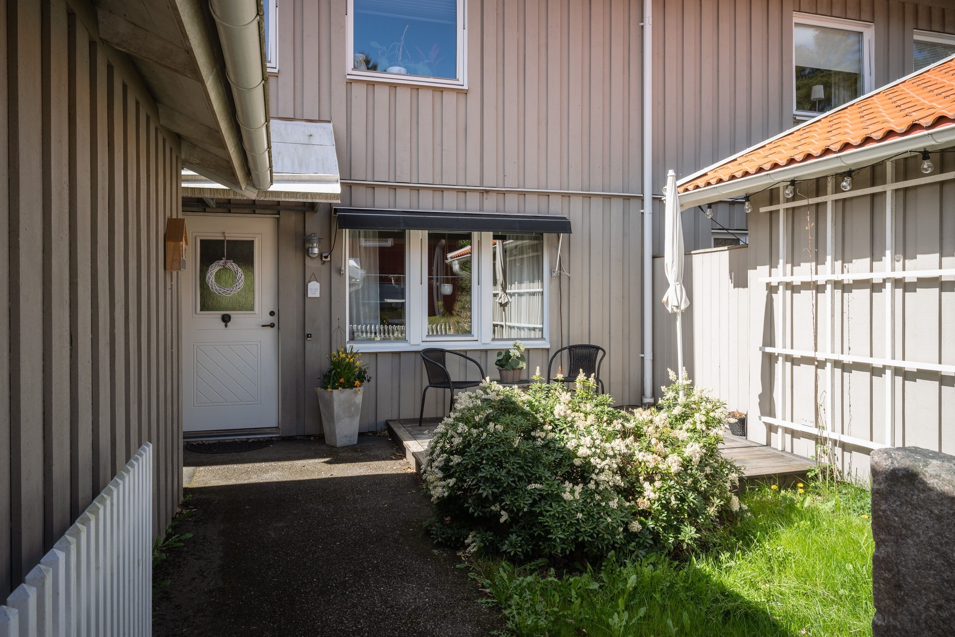 Vi parkerar bilen i garaget eller någon av besöksparkeringarna utanför och har endast en kort promenad till huset. Här möts vi av ett välkomnade och trivsamt radhus med välplanerade ytor, fina uteplatser i ett barnvänligt område med grönskande omgivningar, gångvägar och närhet till naturen. På husets entrésida finns en liten gräsmatta och altan (som tillsammans med altanen på baksidan gjordes i ordning 2021) med plats för ett bord och några stolar för att kunna njuta av frukost eller förmiddagskaffet i solsken. Framsidan ramas in av blommande buskar och ett mindre prydnadsträd som växer utmed en spaljé mot grannens förråd. Härifrån kommer vi även in i det tillhörande förrådet, vilket är isolerat och rymligt med plats för cyklar, trädgårdsredskap, pulkor, skidor, arbetsbänk och övrig förvaring. Entrén ligger väderskyddad under ett skärmtak och vi kliver in i den välkomnande hallen. Här ligger ett grått, tåligt klinkergolv i grått med matchande väggar. Bra förvaringsmöjligheter. Direkt till vänster ligger nedervåningens badrum, utrustat med våtrumsmatta, dusch, WC och handfat med förvaring. Mellan hallen och köket från 2019 sitter en glasvägg för gott ljusinsläpp i intilliggande rum. Köket är stort och ljust, med plats för matbord och upp till sex stolar. Vita skåpsluckor, tåligt laminatgolv och arbetsytor i laminat och rostfritt skapar en funktionell helhet. Utrustningen består av diskmaskin, spis, mikro och kyl/frys – allt från Electrolux, samt en köksfläkt från Franke. Fönstren vetter mot framsidans altan och ger fint ljus till hela rummet. Intill köket med ingång från hallen, ligger tvättstugan med tvättho, separat tvättmaskin och torktumlare samt varmvattenberedare. Vardagsrummet är stort och i vinkel, vilket ger naturligt utrymme för både soffhörna och matsal. Parkettgolv och målade väggar samt fondvägg ger en varm och inbjudande känsla. Från vardagsrummet når du den ostörda trädgården på baksidan – en lugn oas med altan där man har gott om plats för grill och utemöbler. Baksidans gräsmatta inramas av planteringar och ett litet staket. Här njuter du av sol från lunch tills solen sänker sig bakom trädtopparna i väster. För varma dagar finns här även en markis att veva ut för välbehövlig skugga. Övre plan – fyra sovrum och badrum En trappa upp möts du av en delvis möblerbar hall och ingång till fyra sovrum samt badrummet. Sovrum ett ligger direkt till höger och är rymligt, med vita väggar, två fondväggar och tre garderober. Sovrum två har plastmatta, krämfärgade väggar, fondvägg med motiv och plats för dubbelsäng, byrå och garderober. Rummens fönster vetter mot den grönskande trädgården i väster.. På motsatt sida ligger sovrum tre, med laminatgolv, ljusa väggar och medaljongmönster på fondväggarna. Här finns även en inbyggd garderob. Det fjärde rummet används idag som walk-in-closet, med grå nålfiltmatta. Utmed en väggen sitter ett hyllsystem för mycket god och välplanderad plats för klädförvaring, allt dolt bakom ett draperi som löper från vägg till vägg. Badrummet på övre plan renoverades 2015 och är stilrent med brunt klinkergolv, vitt kakel, infällda spotlights och spegelskåp med belysning. Här finns badkar, toalett, handfat med komod samt högskåp och vattenburen handdukstork. Komfortvärme (elektrisk) under golvet. I hallen sitter takluckan för att komma upp till vinden. Denna nås enkelt via utfällbar stege och här uppe finns ytterligare goda förvaringsmöjligheter.