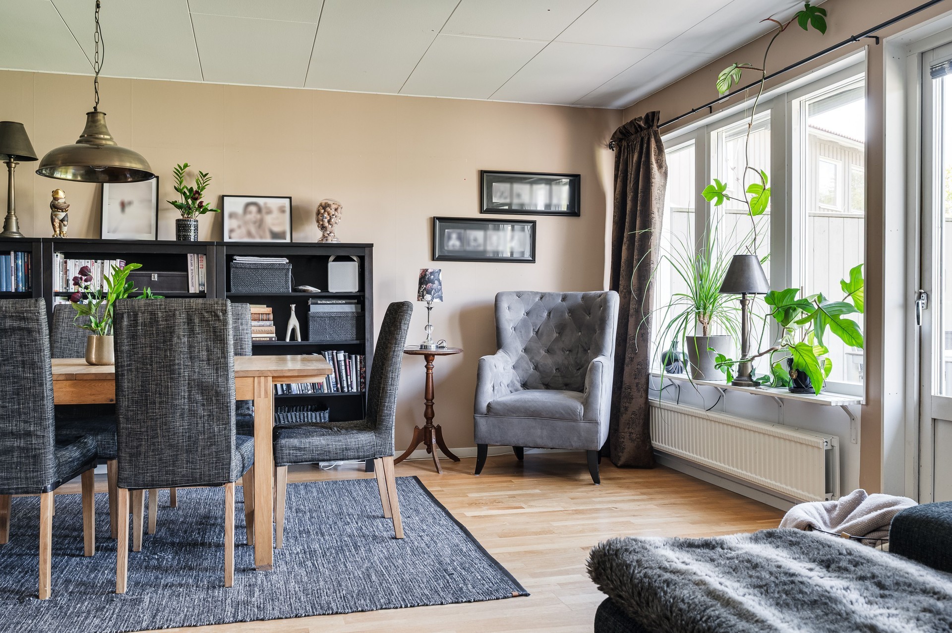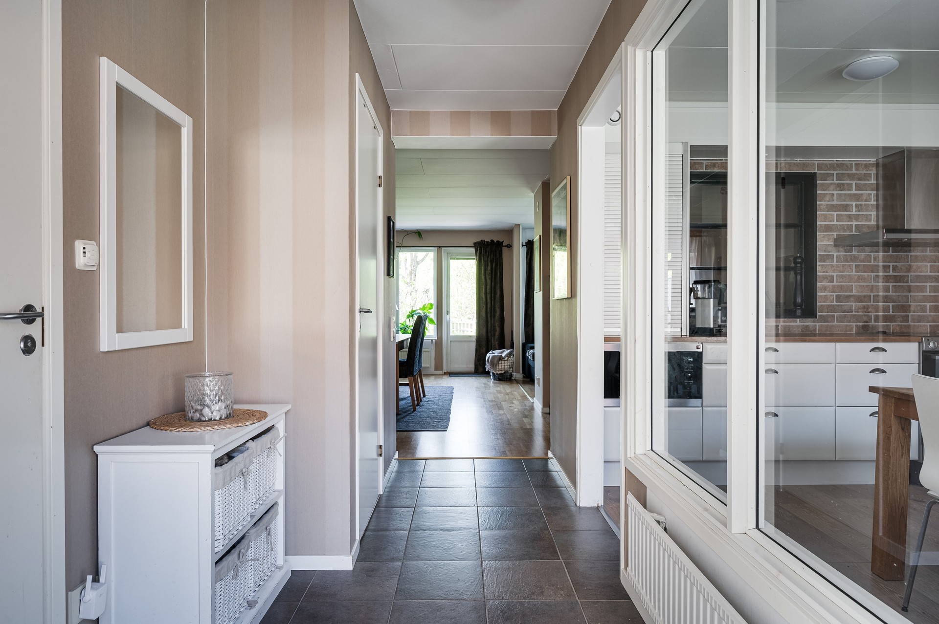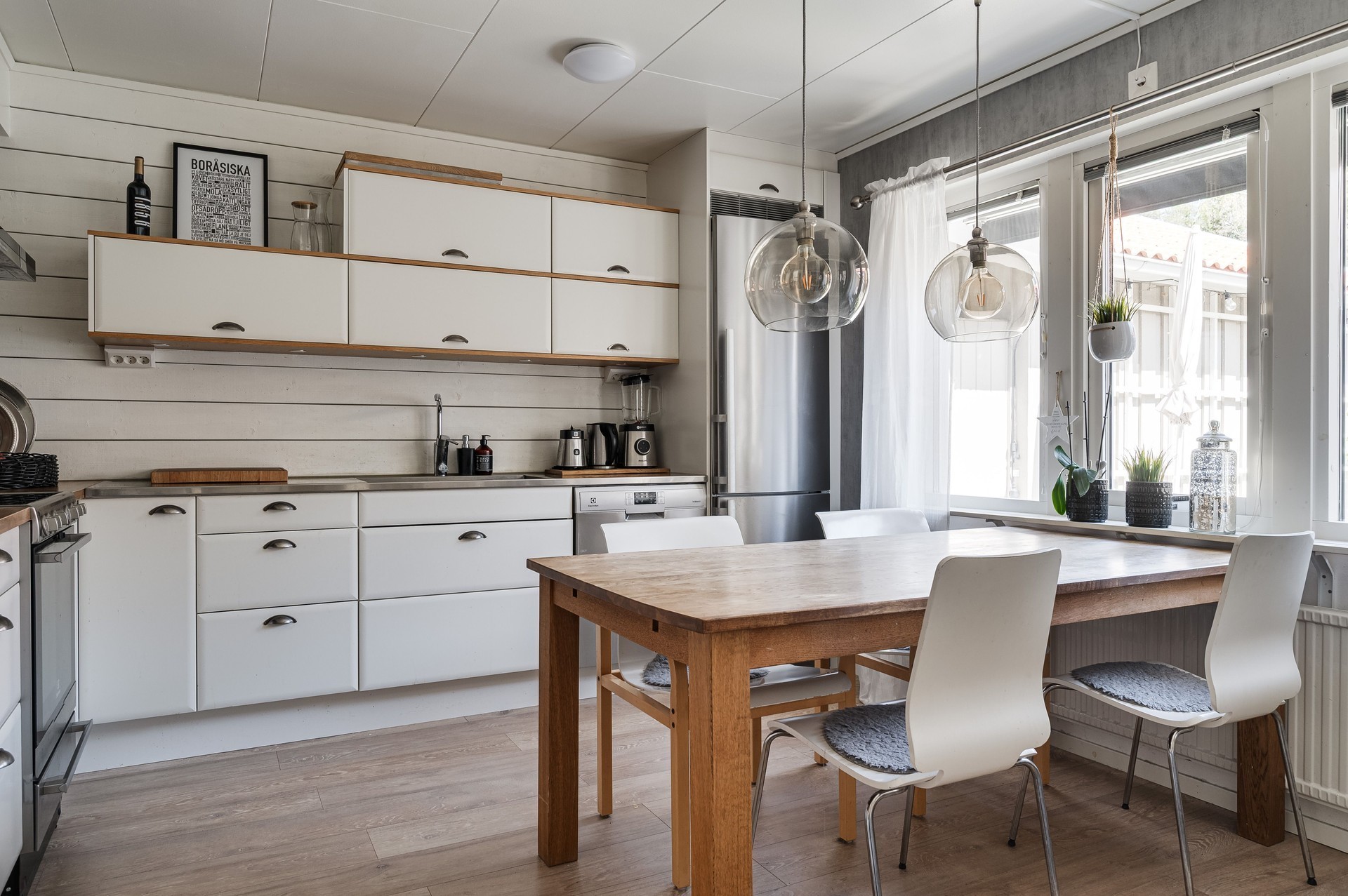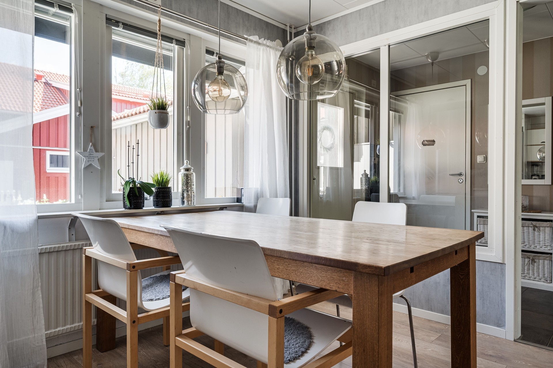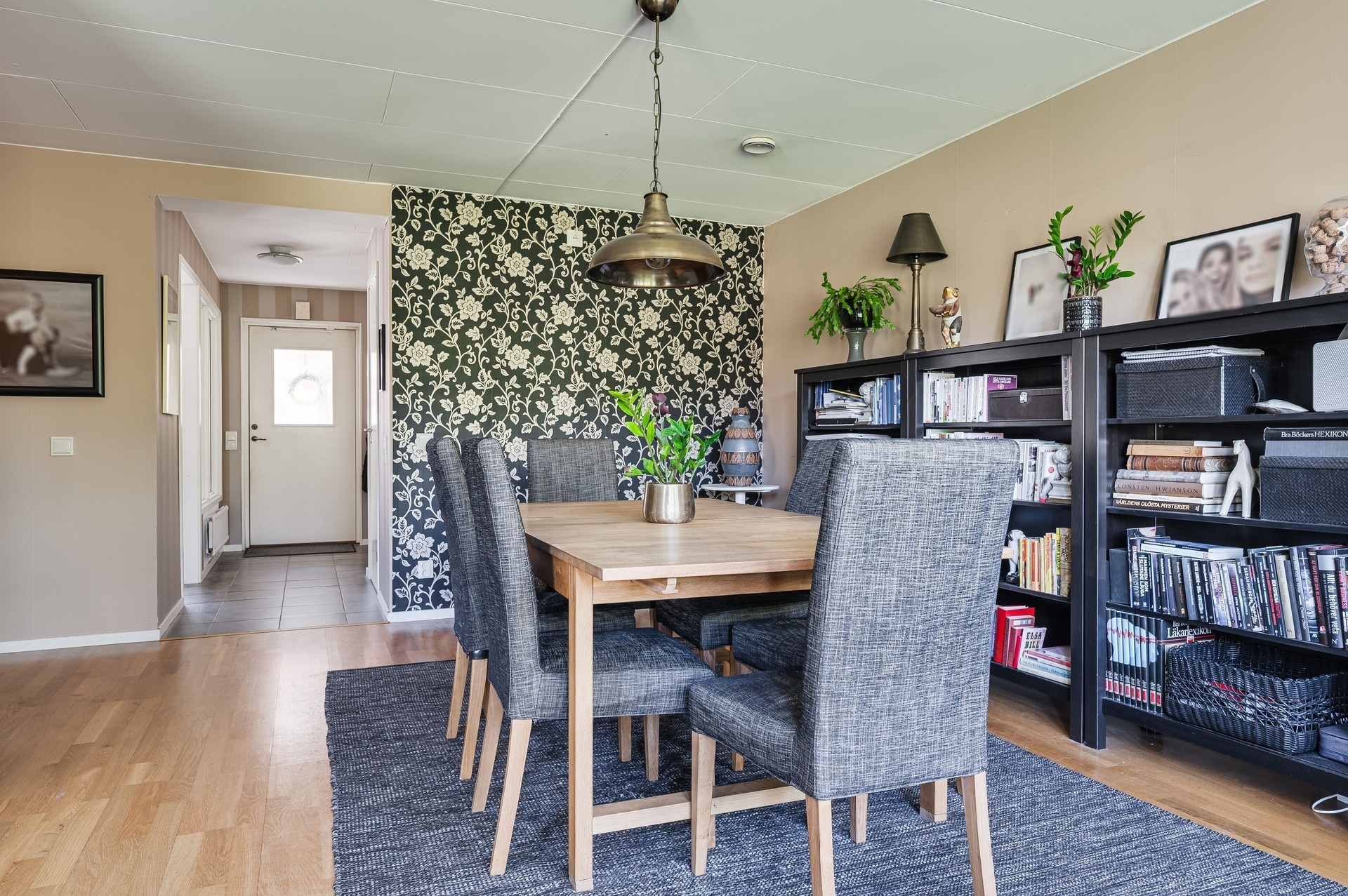 Vi parkerar bilen i garaget eller någon av besöksparkeringarna utanför och har endast en kort promenad till huset. Här möts vi av ett välkomnade och trivsamt radhus med välplanerade ytor, fina uteplatser i ett barnvänligt område med grönskande omgivningar, gångvägar och närhet till naturen. På husets entrésida finns en liten gräsmatta och altan (som tillsammans med altanen på baksidan gjordes i ordning 2021) med plats för ett bord och några stolar för att kunna njuta av frukost eller förmiddagskaffet i solsken. Framsidan ramas in av blommande buskar och ett mindre prydnadsträd som växer utmed en spaljé mot grannens förråd. Härifrån kommer vi även in i det tillhörande förrådet, vilket är isolerat och rymligt med plats för cyklar, trädgårdsredskap, pulkor, skidor, arbetsbänk och övrig förvaring. Entrén ligger väderskyddad under ett skärmtak och vi kliver in i den välkomnande hallen. Här ligger ett grått, tåligt klinkergolv i grått med matchande väggar. Bra förvaringsmöjligheter. Direkt till vänster ligger nedervåningens badrum, utrustat med våtrumsmatta, dusch, WC och handfat med förvaring. Mellan hallen och köket från 2019 sitter en glasvägg för gott ljusinsläpp i intilliggande rum. Köket är stort och ljust, med plats för matbord och upp till sex stolar. Vita skåpsluckor, tåligt laminatgolv och arbetsytor i laminat och rostfritt skapar en funktionell helhet. Utrustningen består av diskmaskin, spis, mikro och kyl/frys – allt från Electrolux, samt en köksfläkt från Franke. Fönstren vetter mot framsidans altan och ger fint ljus till hela rummet. Intill köket med ingång från hallen, ligger tvättstugan med tvättho, separat tvättmaskin och torktumlare samt varmvattenberedare. Vardagsrummet är stort och i vinkel, vilket ger naturligt utrymme för både soffhörna och matsal. Parkettgolv och målade väggar samt fondvägg ger en varm och inbjudande känsla. Från vardagsrummet når du den ostörda trädgården på baksidan – en lugn oas med altan där man har gott om plats för grill och utemöbler. Baksidans gräsmatta inramas av planteringar och ett litet staket. Här njuter du av sol från lunch tills solen sänker sig bakom trädtopparna i väster. För varma dagar finns här även en markis att veva ut för välbehövlig skugga. Övre plan – fyra sovrum och badrum En trappa upp möts du av en delvis möblerbar hall och ingång till fyra sovrum samt badrummet. Sovrum ett ligger direkt till höger och är rymligt, med vita väggar, två fondväggar och tre garderober. Sovrum två har plastmatta, krämfärgade väggar, fondvägg med motiv och plats för dubbelsäng, byrå och garderober. Rummens fönster vetter mot den grönskande trädgården i väster.. På motsatt sida ligger sovrum tre, med laminatgolv, ljusa väggar och medaljongmönster på fondväggarna. Här finns även en inbyggd garderob. Det fjärde rummet används idag som walk-in-closet, med grå nålfiltmatta. Utmed en väggen sitter ett hyllsystem för mycket god och välplanderad plats för klädförvaring, allt dolt bakom ett draperi som löper från vägg till vägg. Badrummet på övre plan renoverades 2015 och är stilrent med brunt klinkergolv, vitt kakel, infällda spotlights och spegelskåp med belysning. Här finns badkar, toalett, handfat med komod samt högskåp och vattenburen handdukstork. Komfortvärme (elektrisk) under golvet. I hallen sitter takluckan för att komma upp till vinden. Denna nås enkelt via utfällbar stege och här uppe finns ytterligare goda förvaringsmöjligheter.