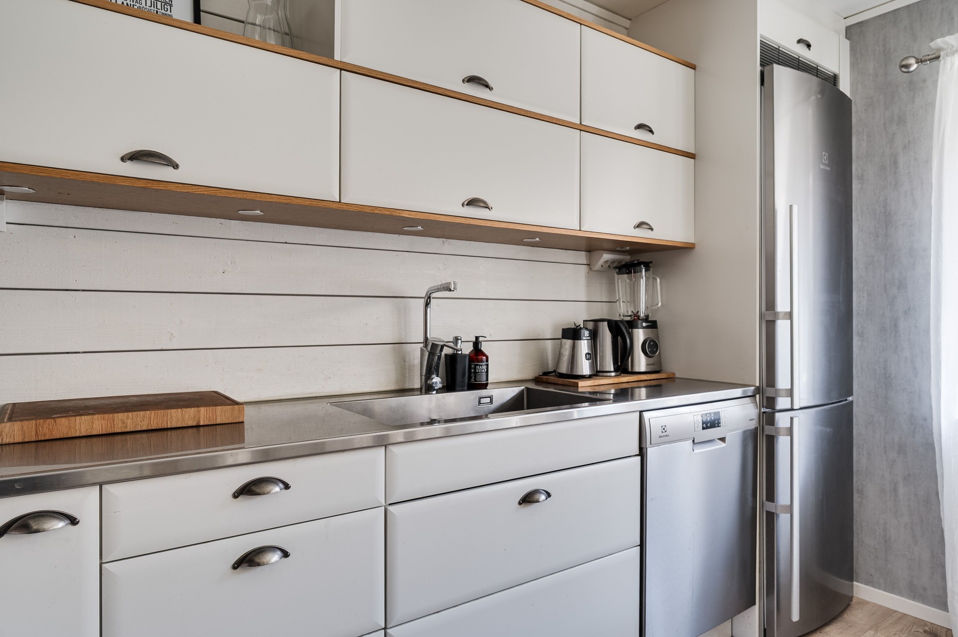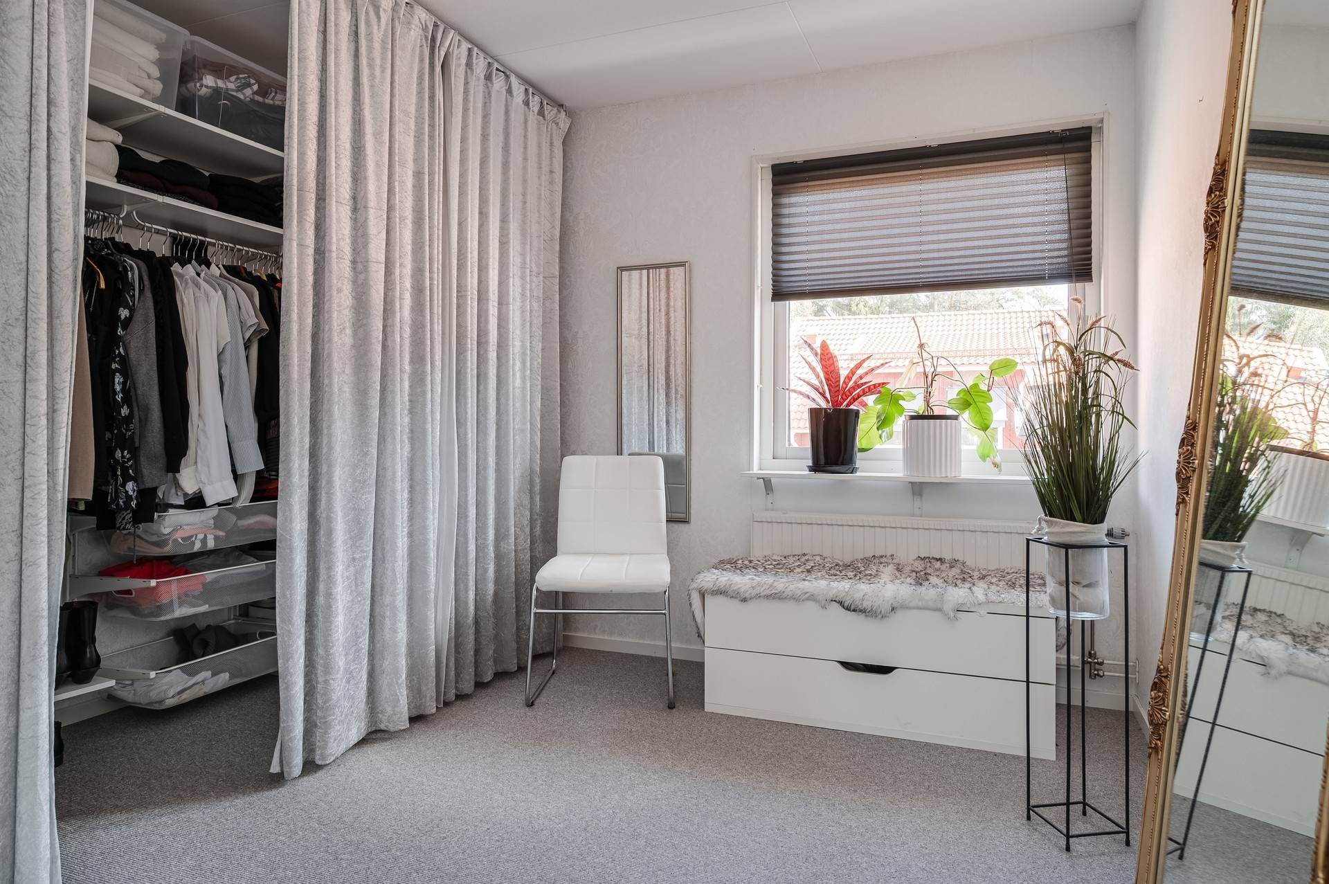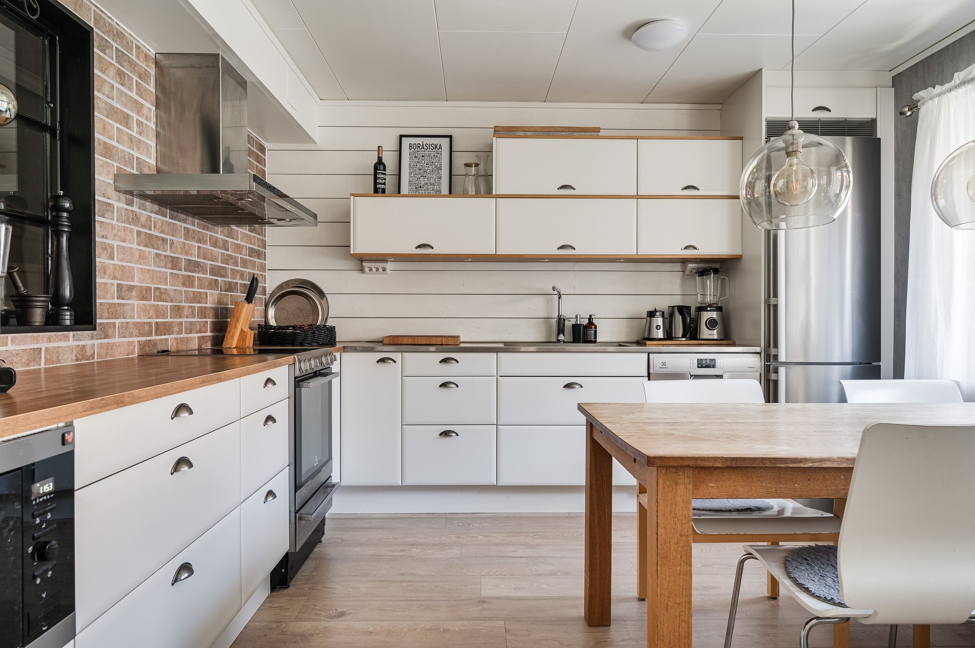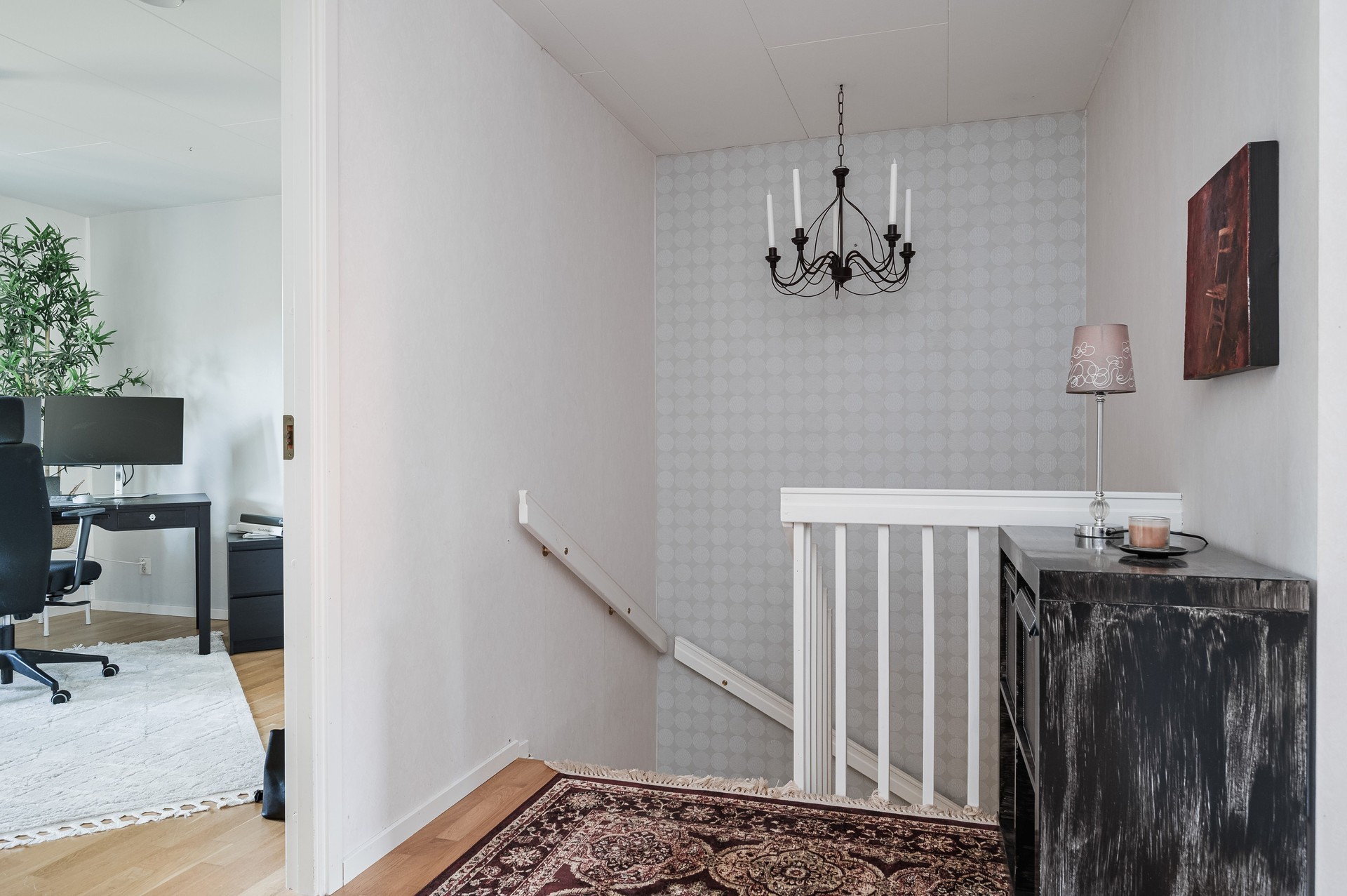 Vi parkerar bilen i garaget eller någon av besöksparkeringarna utanför och har endast en kort promenad till huset. Här möts vi av ett välkomnade och trivsamt radhus med välplanerade ytor, fina uteplatser i ett barnvänligt område med grönskande omgivningar, gångvägar och närhet till naturen. På husets entrésida finns en liten gräsmatta och altan (som tillsammans med altanen på baksidan gjordes i ordning 2021) med plats för ett bord och några stolar för att kunna njuta av frukost eller förmiddagskaffet i solsken. Framsidan ramas in av blommande buskar och ett mindre prydnadsträd som växer utmed en spaljé mot grannens förråd. Härifrån kommer vi även in i det tillhörande förrådet, vilket är isolerat och rymligt med plats för cyklar, trädgårdsredskap, pulkor, skidor, arbetsbänk och övrig förvaring. Entrén ligger väderskyddad under ett skärmtak och vi kliver in i den välkomnande hallen. Här ligger ett grått, tåligt klinkergolv i grått med matchande väggar. Bra förvaringsmöjligheter. Direkt till vänster ligger nedervåningens badrum, utrustat med våtrumsmatta, dusch, WC och handfat med förvaring. Mellan hallen och köket från 2019 sitter en glasvägg för gott ljusinsläpp i intilliggande rum. Köket är stort och ljust, med plats för matbord och upp till sex stolar. Vita skåpsluckor, tåligt laminatgolv och arbetsytor i laminat och rostfritt skapar en funktionell helhet. Utrustningen består av diskmaskin, spis, mikro och kyl/frys – allt från Electrolux, samt en köksfläkt från Franke. Fönstren vetter mot framsidans altan och ger fint ljus till hela rummet. Intill köket med ingång från hallen, ligger tvättstugan med tvättho, separat tvättmaskin och torktumlare samt varmvattenberedare. Vardagsrummet är stort och i vinkel, vilket ger naturligt utrymme för både soffhörna och matsal. Parkettgolv och målade väggar samt fondvägg ger en varm och inbjudande känsla. Från vardagsrummet når du den ostörda trädgården på baksidan – en lugn oas med altan där man har gott om plats för grill och utemöbler. Baksidans gräsmatta inramas av planteringar och ett litet staket. Här njuter du av sol från lunch tills solen sänker sig bakom trädtopparna i väster. För varma dagar finns här även en markis att veva ut för välbehövlig skugga. Övre plan – fyra sovrum och badrum En trappa upp möts du av en delvis möblerbar hall och ingång till fyra sovrum samt badrummet. Sovrum ett ligger direkt till höger och är rymligt, med vita väggar, två fondväggar och tre garderober. Sovrum två har plastmatta, krämfärgade väggar, fondvägg med motiv och plats för dubbelsäng, byrå och garderober. Rummens fönster vetter mot den grönskande trädgården i väster.. På motsatt sida ligger sovrum tre, med laminatgolv, ljusa väggar och medaljongmönster på fondväggarna. Här finns även en inbyggd garderob. Det fjärde rummet används idag som walk-in-closet, med grå nålfiltmatta. Utmed en väggen sitter ett hyllsystem för mycket god och välplanderad plats för klädförvaring, allt dolt bakom ett draperi som löper från vägg till vägg. Badrummet på övre plan renoverades 2015 och är stilrent med brunt klinkergolv, vitt kakel, infällda spotlights och spegelskåp med belysning. Här finns badkar, toalett, handfat med komod samt högskåp och vattenburen handdukstork. Komfortvärme (elektrisk) under golvet. I hallen sitter takluckan för att komma upp till vinden. Denna nås enkelt via utfällbar stege och här uppe finns ytterligare goda förvaringsmöjligheter.