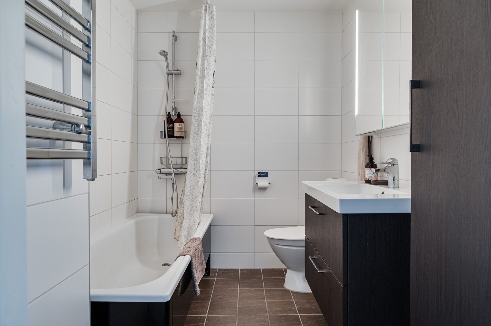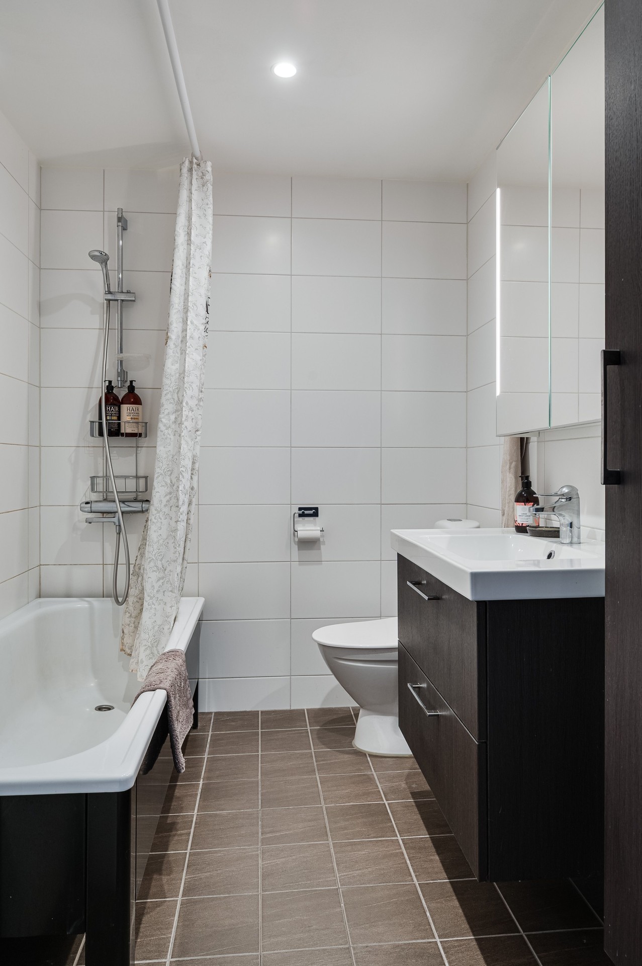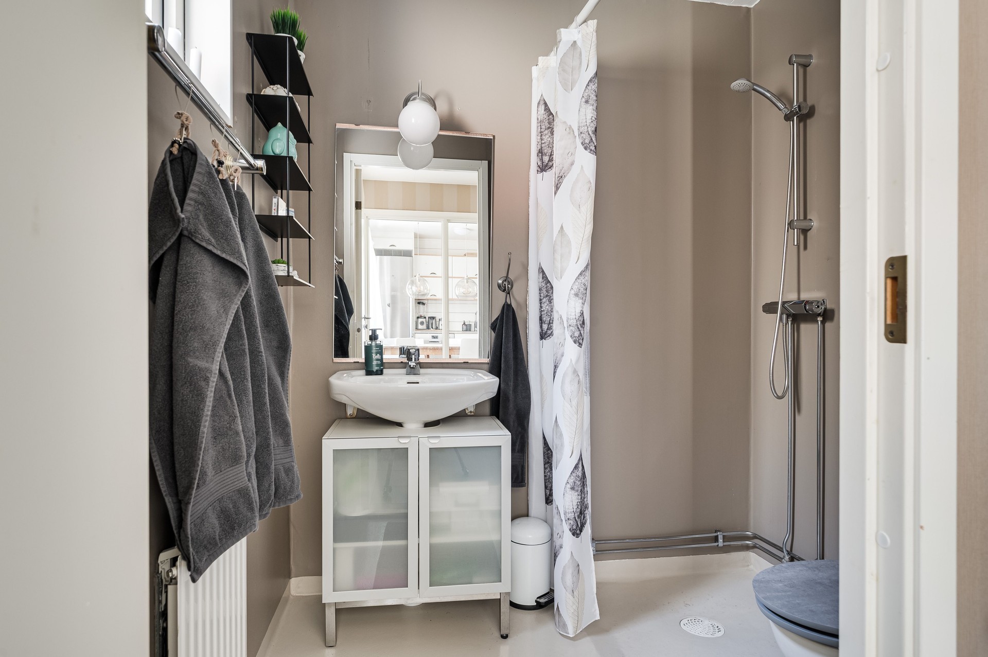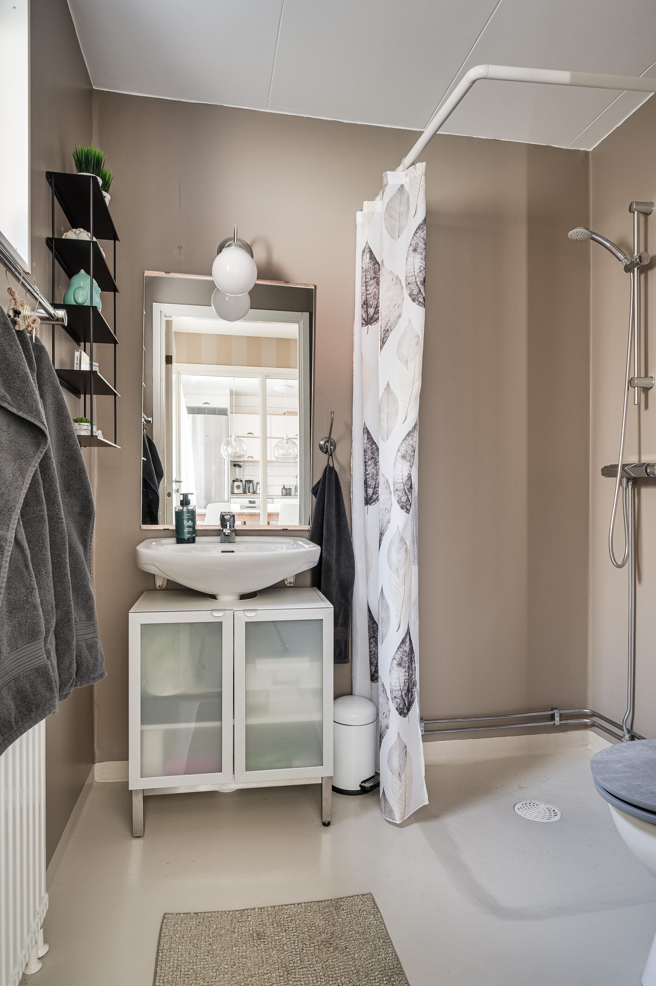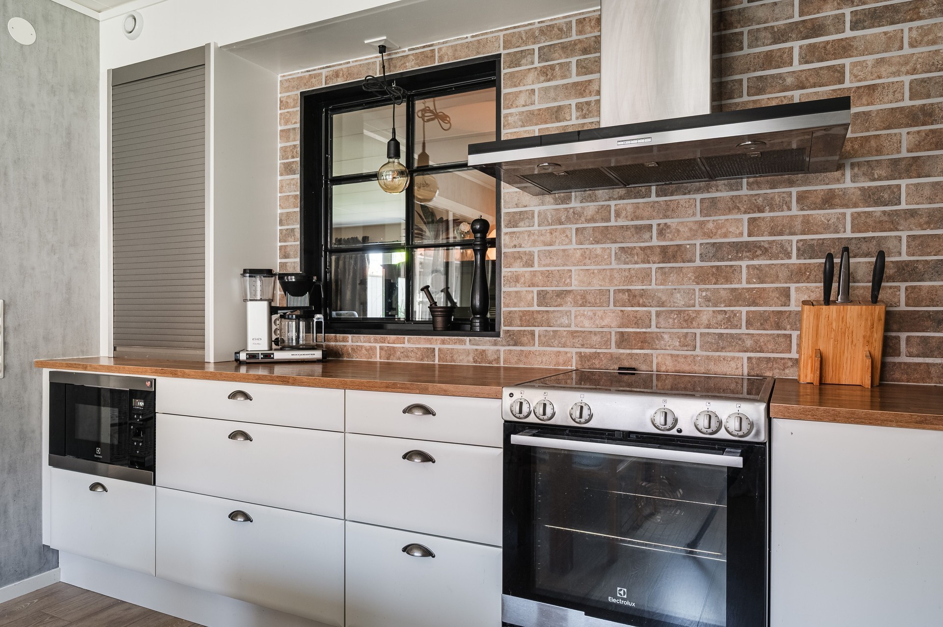 Vi parkerar bilen i garaget eller någon av besöksparkeringarna utanför och har endast en kort promenad till huset. Här möts vi av ett välkomnade och trivsamt radhus med välplanerade ytor, fina uteplatser i ett barnvänligt område med grönskande omgivningar, gångvägar och närhet till naturen. På husets entrésida finns en liten gräsmatta och altan (som tillsammans med altanen på baksidan gjordes i ordning 2021) med plats för ett bord och några stolar för att kunna njuta av frukost eller förmiddagskaffet i solsken. Framsidan ramas in av blommande buskar och ett mindre prydnadsträd som växer utmed en spaljé mot grannens förråd. Härifrån kommer vi även in i det tillhörande förrådet, vilket är isolerat och rymligt med plats för cyklar, trädgårdsredskap, pulkor, skidor, arbetsbänk och övrig förvaring. Entrén ligger väderskyddad under ett skärmtak och vi kliver in i den välkomnande hallen. Här ligger ett grått, tåligt klinkergolv i grått med matchande väggar. Bra förvaringsmöjligheter. Direkt till vänster ligger nedervåningens badrum, utrustat med våtrumsmatta, dusch, WC och handfat med förvaring. Mellan hallen och köket från 2019 sitter en glasvägg för gott ljusinsläpp i intilliggande rum. Köket är stort och ljust, med plats för matbord och upp till sex stolar. Vita skåpsluckor, tåligt laminatgolv och arbetsytor i laminat och rostfritt skapar en funktionell helhet. Utrustningen består av diskmaskin, spis, mikro och kyl/frys – allt från Electrolux, samt en köksfläkt från Franke. Fönstren vetter mot framsidans altan och ger fint ljus till hela rummet. Intill köket med ingång från hallen, ligger tvättstugan med tvättho, separat tvättmaskin och torktumlare samt varmvattenberedare. Vardagsrummet är stort och i vinkel, vilket ger naturligt utrymme för både soffhörna och matsal. Parkettgolv och målade väggar samt fondvägg ger en varm och inbjudande känsla. Från vardagsrummet når du den ostörda trädgården på baksidan – en lugn oas med altan där man har gott om plats för grill och utemöbler. Baksidans gräsmatta inramas av planteringar och ett litet staket. Här njuter du av sol från lunch tills solen sänker sig bakom trädtopparna i väster. För varma dagar finns här även en markis att veva ut för välbehövlig skugga. Övre plan – fyra sovrum och badrum En trappa upp möts du av en delvis möblerbar hall och ingång till fyra sovrum samt badrummet. Sovrum ett ligger direkt till höger och är rymligt, med vita väggar, två fondväggar och tre garderober. Sovrum två har plastmatta, krämfärgade väggar, fondvägg med motiv och plats för dubbelsäng, byrå och garderober. Rummens fönster vetter mot den grönskande trädgården i väster.. På motsatt sida ligger sovrum tre, med laminatgolv, ljusa väggar och medaljongmönster på fondväggarna. Här finns även en inbyggd garderob. Det fjärde rummet används idag som walk-in-closet, med grå nålfiltmatta. Utmed en väggen sitter ett hyllsystem för mycket god och välplanderad plats för klädförvaring, allt dolt bakom ett draperi som löper från vägg till vägg. Badrummet på övre plan renoverades 2015 och är stilrent med brunt klinkergolv, vitt kakel, infällda spotlights och spegelskåp med belysning. Här finns badkar, toalett, handfat med komod samt högskåp och vattenburen handdukstork. Komfortvärme (elektrisk) under golvet. I hallen sitter takluckan för att komma upp till vinden. Denna nås enkelt via utfällbar stege och här uppe finns ytterligare goda förvaringsmöjligheter.