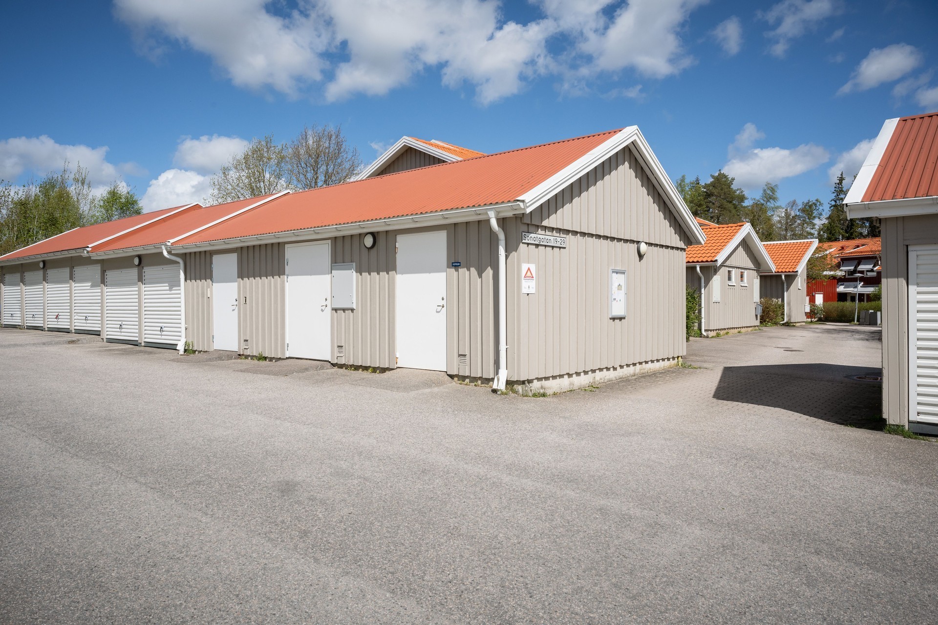 Till varje lägenheten hör en garageplats. Utanför garagen finns fria onumrerade parkeringar.