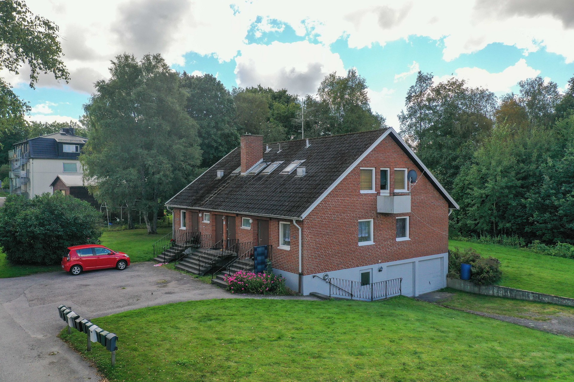 Parkering: Garage i källaren med plats för två bilar. Hyrs ut separat. Parkering på uppfart framför entrén med plats för 4-5 bilar.