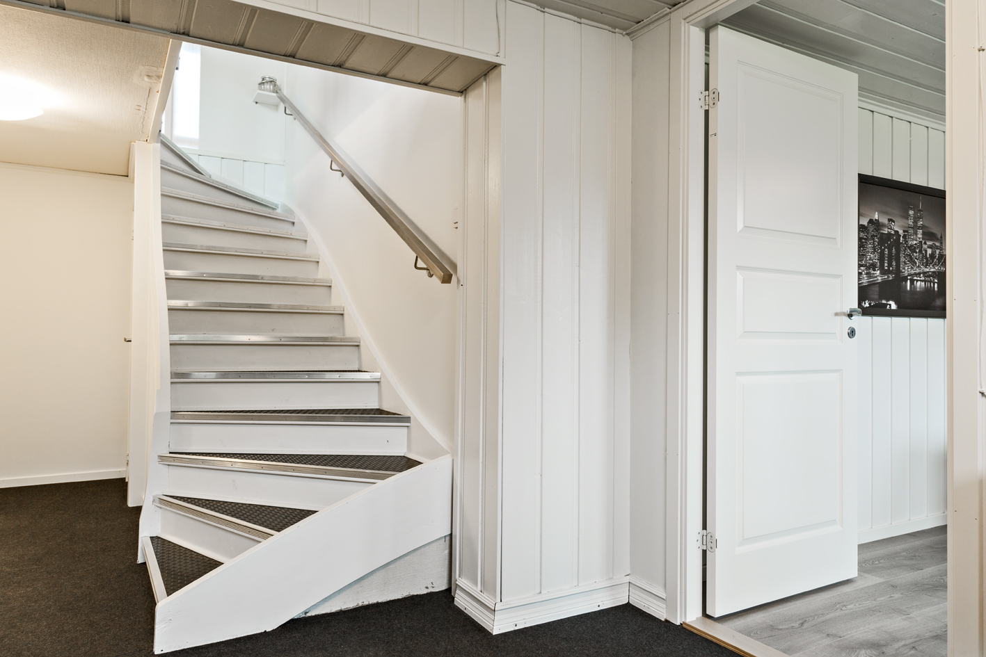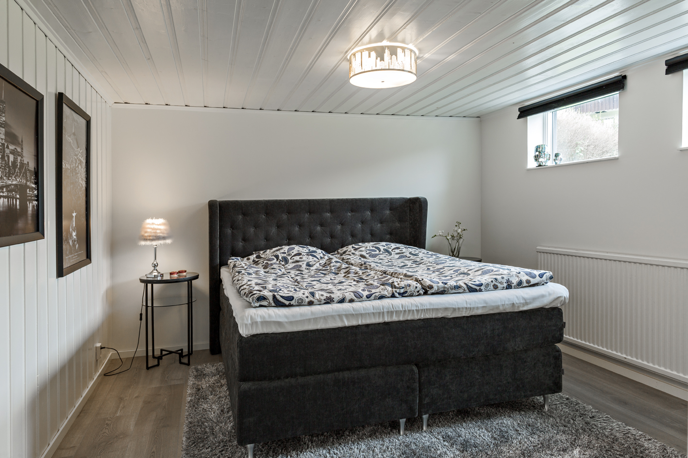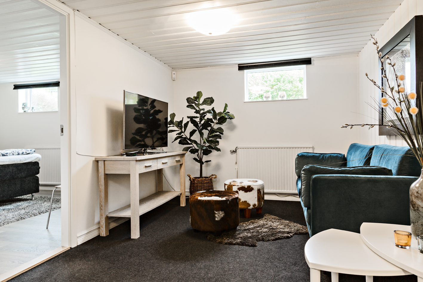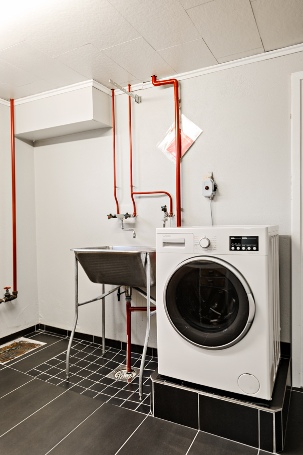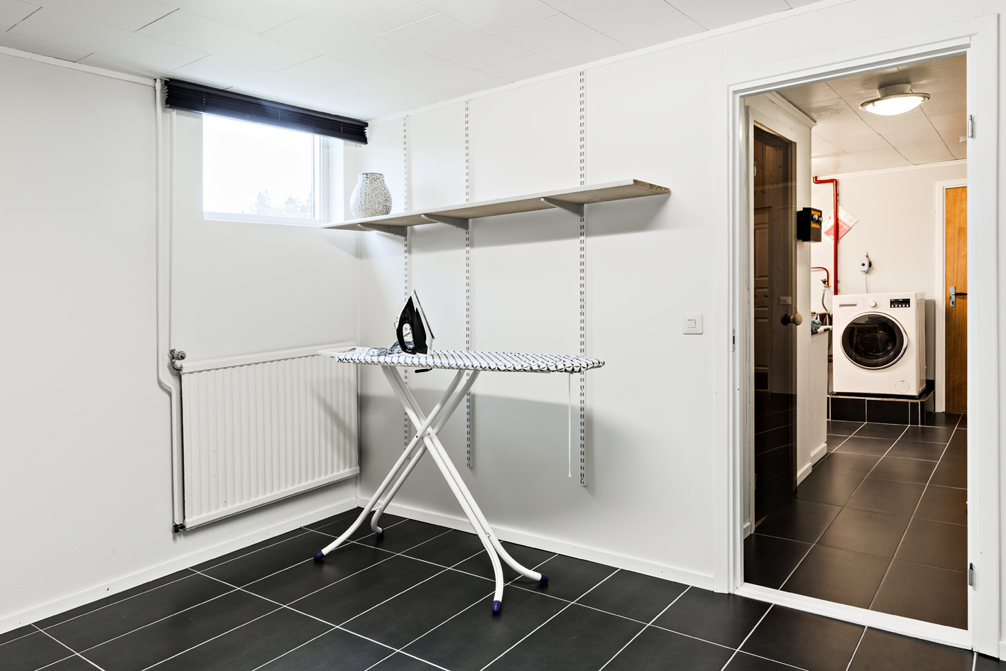 Direkt nedanför trappan finns ett allrum med heltäckningsmatta och ljusa vita väggar. Här finns gott om utrymme för barnen att få en egen spel- tv-hörna. Det fjärde sovrummen ligger direkt innanför till vänster. Ljusa färg och materialval gör tillsammans med stora källarfönster att rummet känns stort och rymligt. Hallen leder bort till det femte sovrummet som är husets största. Här finns gott om plats för både garderober och övrig klädförvaring. Tvättstugan går i rött/vitt/svart med ett svart klinkergolv och vita väggar. Här finns tvättmaskin samt plats för hängande torkning. Här finns även en praktisk tvättho. Helkaklad dusch med bastu samt nytt aggregat. Övriga utrymmen i källaren består av förråd, wc med toalett och handfat. Från källarplanet kommer vi upp till garaget. Här är även pannan placerad