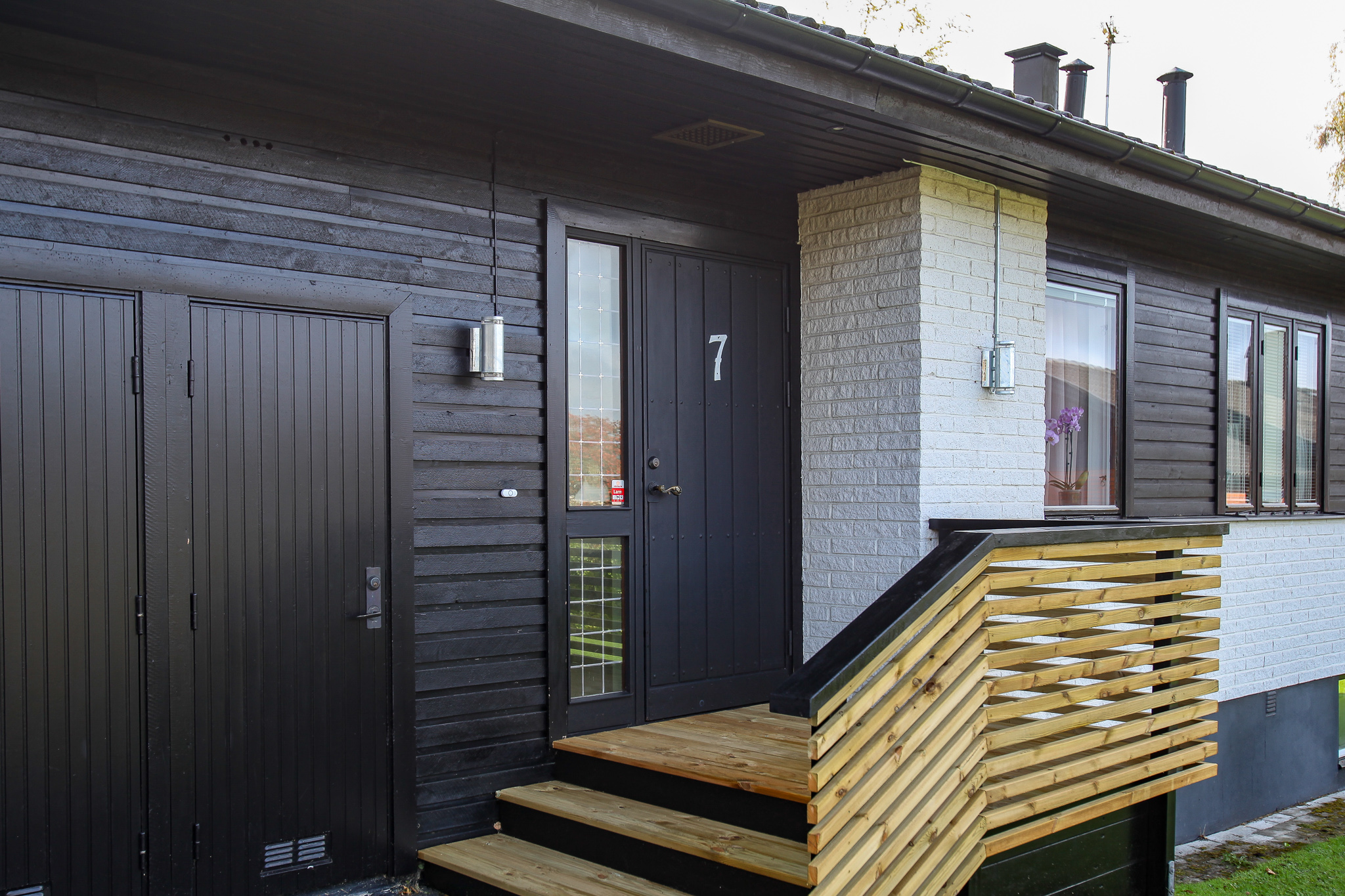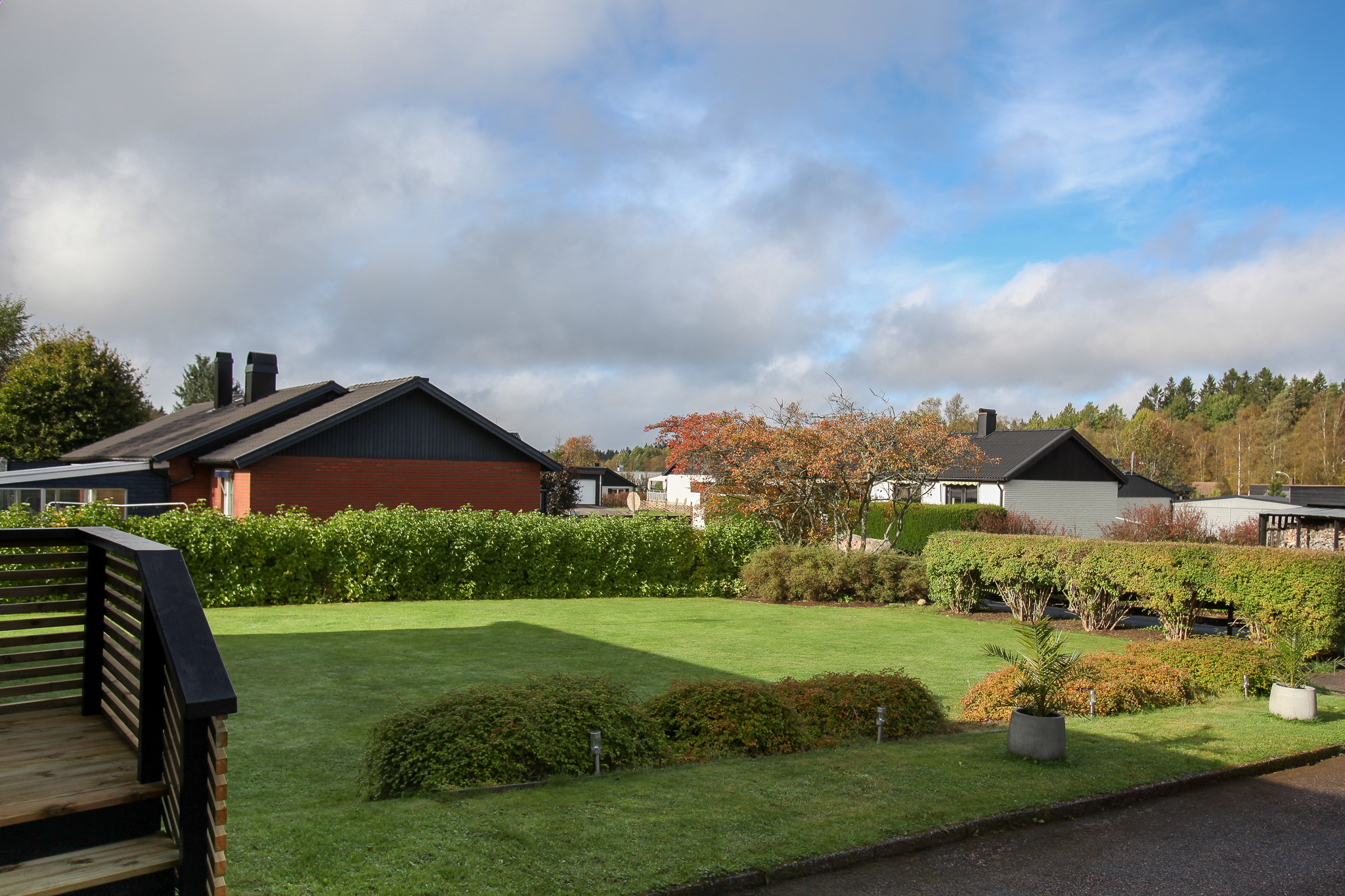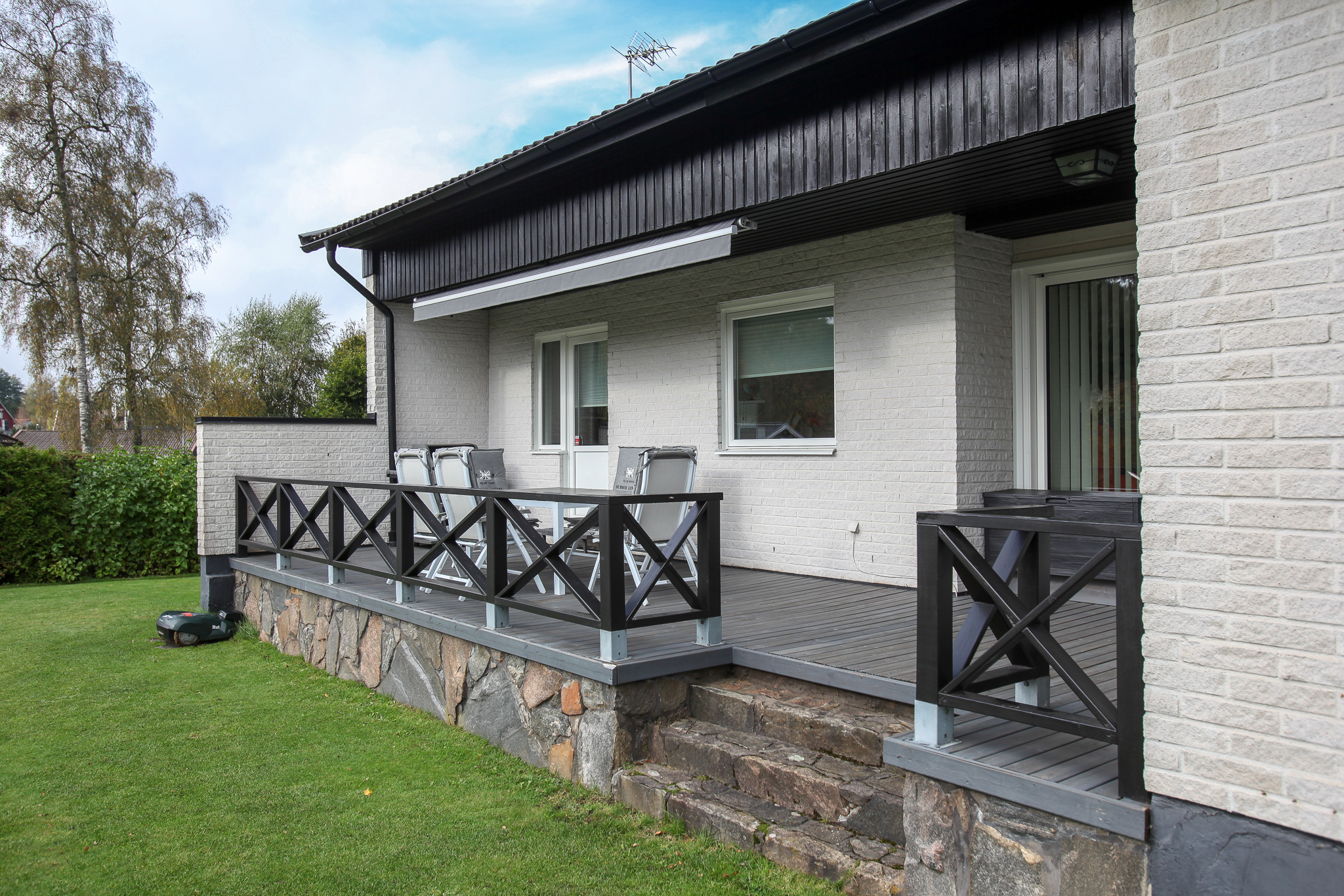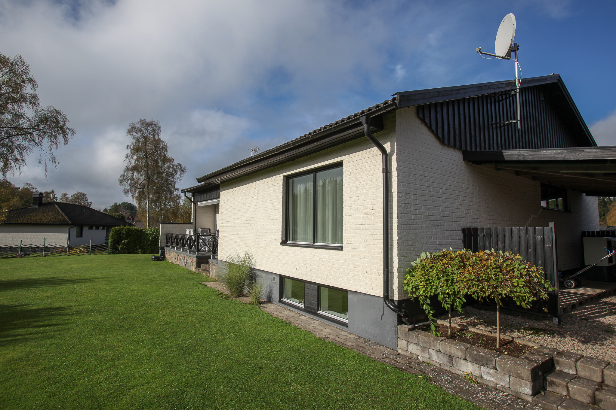 Från parkeringen på uppfarten framför huset eller i garaget har vi nära till entrétrappan och hallen. Här ligger ett snyggt och på samma gång tåligt klinkergolv och gott om plats för förvaring finns i garderoberna på vänster sida innanför dörren. Köket, hallen och vardagsrummet bildar tillsammans en öppen planlösning med stora sällskapsytor. Den vita stilrena inredningen har släta luckor och lådfronter med infällda handtag. De rostfria vitvarorna från Siemens och Bosch består av induktionshäll, varmluftsugn, fläkt, micro, integrerad diskmaskin samt kyl/frys av kombimodell. Tålig marmormönstrad bänkskiva matchas däröver med ett matchande klinker som stänkskydd. Matplatsen är centralt placerad och härifrån nås enkelt den stora altanen utanför, eller vardagsrummet och kök. Ett ljust golv löper genom husets alla rum såväl uppe som nere. Vardagsrummet är stort med plats för både soffgrupp som matsalsgrupp. Även från detta rum kommer vi via skjutdörrar ut till baksidans rymliga altan och trädgården nedanför. Altanen är delvis skyddad under tak och vid behov finns en stor markis som skyddar resten av altanen. Hallen leder från köket bort mot våningsplanets 3 sovrum. Sovrum 1 ligger direkt på vänster hand och härifrån har vi utsikt över trädgården och altanen på husets baksida. Plats för säng och klädförvaring. Sovrum 2 är väl tilltaget och har plats för såväl säng som för skrivbord och fåtölj. Härifrån kommer vi även vidare ut till altanen genom en ny altandörr. Målade väggar samt heltäckningsmatta gör rummet ombonat. Gott om plats för klädförvaring bakom spegelskjutdörrar i 3 garderober.Våningens tredje sovrum är rymligt och har plats för dubbelsäng. Här finns även gott om väggfasta garderober med gott om förvaringsutrymme. Badrummet ligger i anslutning till sovrummen. Detta har våtrumsmatta och kakel på väggarna. Fräsch inredning med badkar, handfat samt toalett. Från hallen tar vi trappan ner till källarplanet. Ett nytt räcke och handtag i rostfritt och glas ger bra ljusinsläpp mellan våningarna och bidrar till den öppna planlösningen.