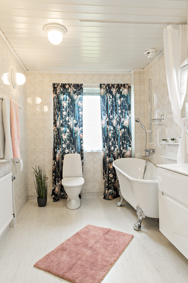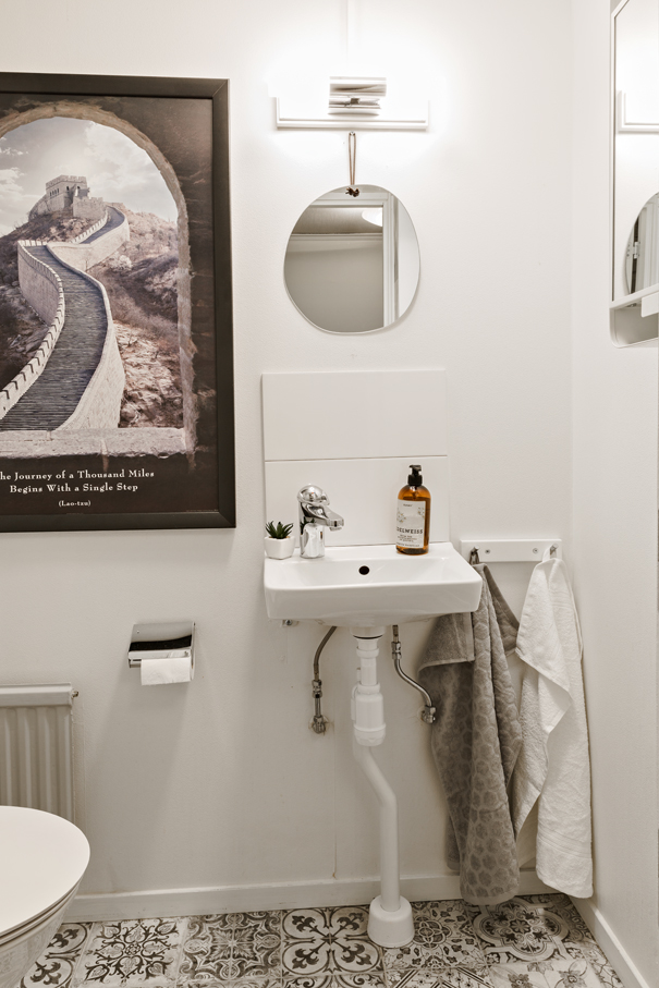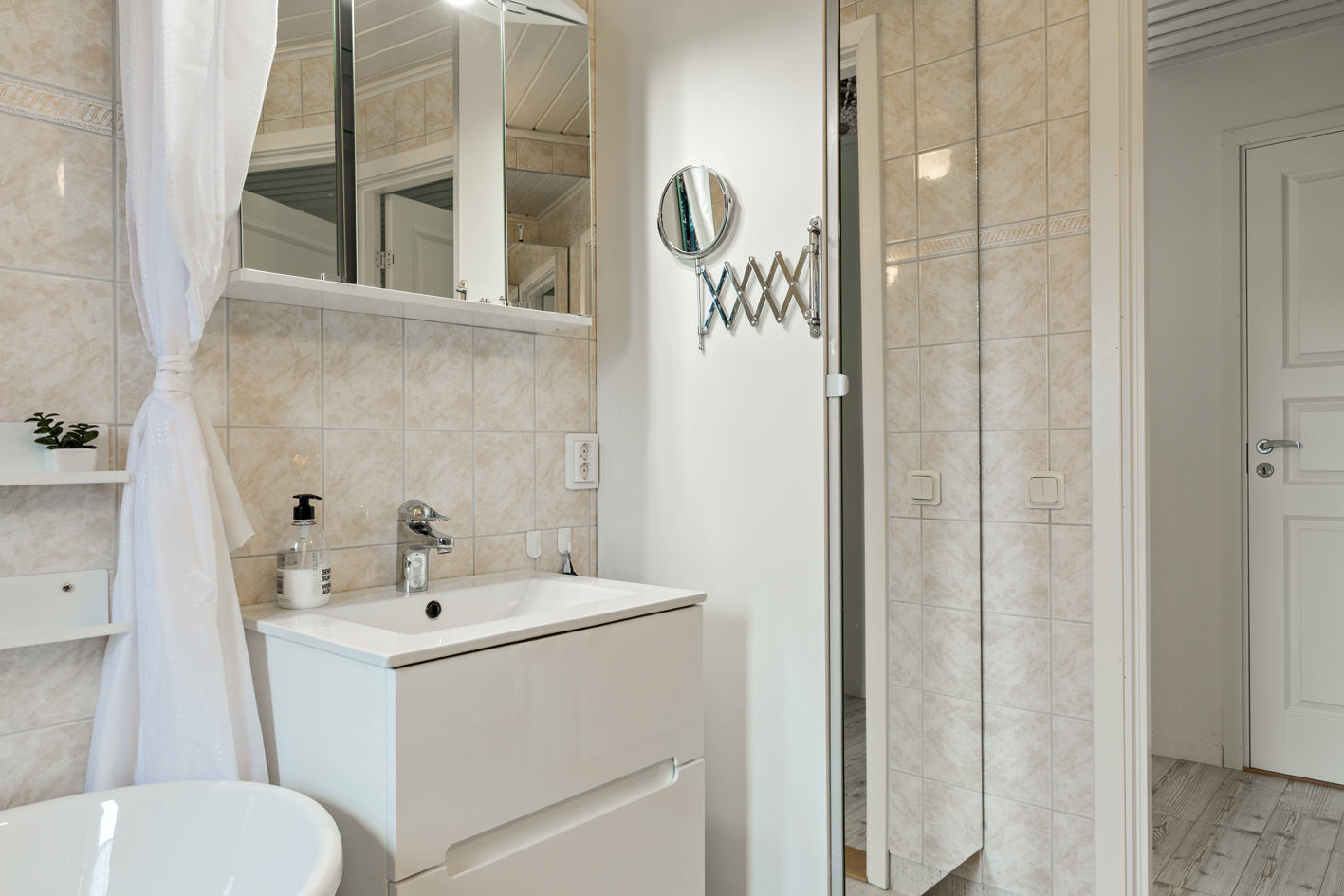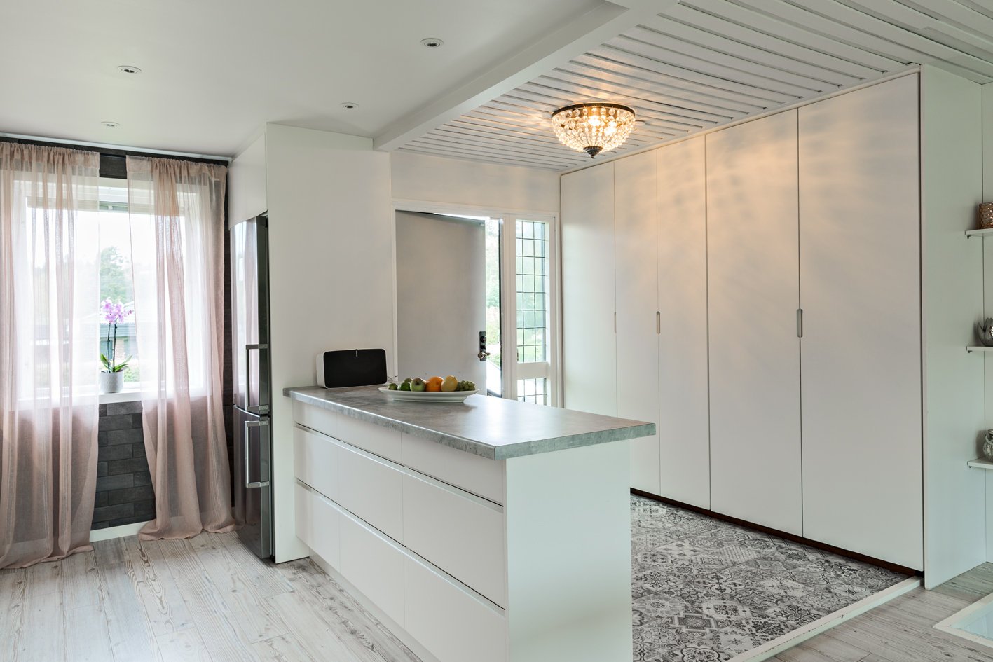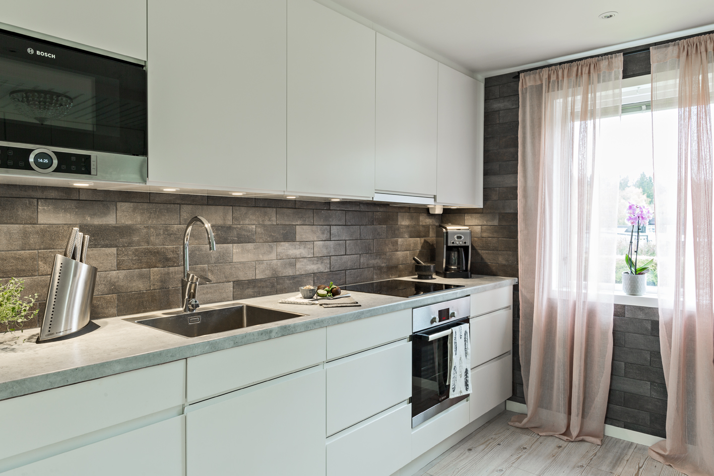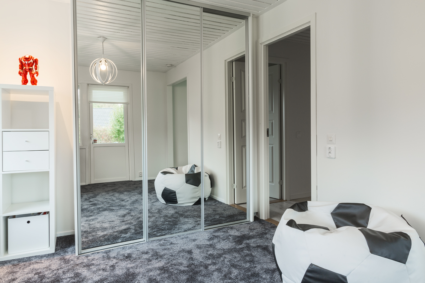 Från parkeringen på uppfarten framför huset eller i garaget har vi nära till entrétrappan och hallen. Här ligger ett snyggt och på samma gång tåligt klinkergolv och gott om plats för förvaring finns i garderoberna på vänster sida innanför dörren. Köket, hallen och vardagsrummet bildar tillsammans en öppen planlösning med stora sällskapsytor. Den vita stilrena inredningen har släta luckor och lådfronter med infällda handtag. De rostfria vitvarorna från Siemens och Bosch består av induktionshäll, varmluftsugn, fläkt, micro, integrerad diskmaskin samt kyl/frys av kombimodell. Tålig marmormönstrad bänkskiva matchas däröver med ett matchande klinker som stänkskydd. Matplatsen är centralt placerad och härifrån nås enkelt den stora altanen utanför, eller vardagsrummet och kök. Ett ljust golv löper genom husets alla rum såväl uppe som nere. Vardagsrummet är stort med plats för både soffgrupp som matsalsgrupp. Även från detta rum kommer vi via skjutdörrar ut till baksidans rymliga altan och trädgården nedanför. Altanen är delvis skyddad under tak och vid behov finns en stor markis som skyddar resten av altanen. Hallen leder från köket bort mot våningsplanets 3 sovrum. Sovrum 1 ligger direkt på vänster hand och härifrån har vi utsikt över trädgården och altanen på husets baksida. Plats för säng och klädförvaring. Sovrum 2 är väl tilltaget och har plats för såväl säng som för skrivbord och fåtölj. Härifrån kommer vi även vidare ut till altanen genom en ny altandörr. Målade väggar samt heltäckningsmatta gör rummet ombonat. Gott om plats för klädförvaring bakom spegelskjutdörrar i 3 garderober.Våningens tredje sovrum är rymligt och har plats för dubbelsäng. Här finns även gott om väggfasta garderober med gott om förvaringsutrymme. Badrummet ligger i anslutning till sovrummen. Detta har våtrumsmatta och kakel på väggarna. Fräsch inredning med badkar, handfat samt toalett. Från hallen tar vi trappan ner till källarplanet. Ett nytt räcke och handtag i rostfritt och glas ger bra ljusinsläpp mellan våningarna och bidrar till den öppna planlösningen.