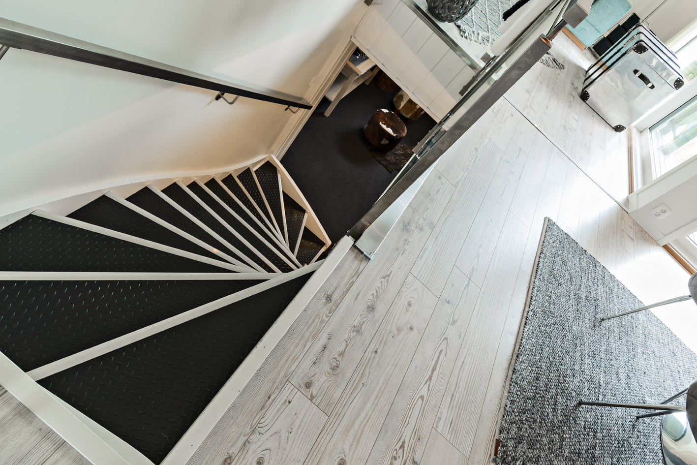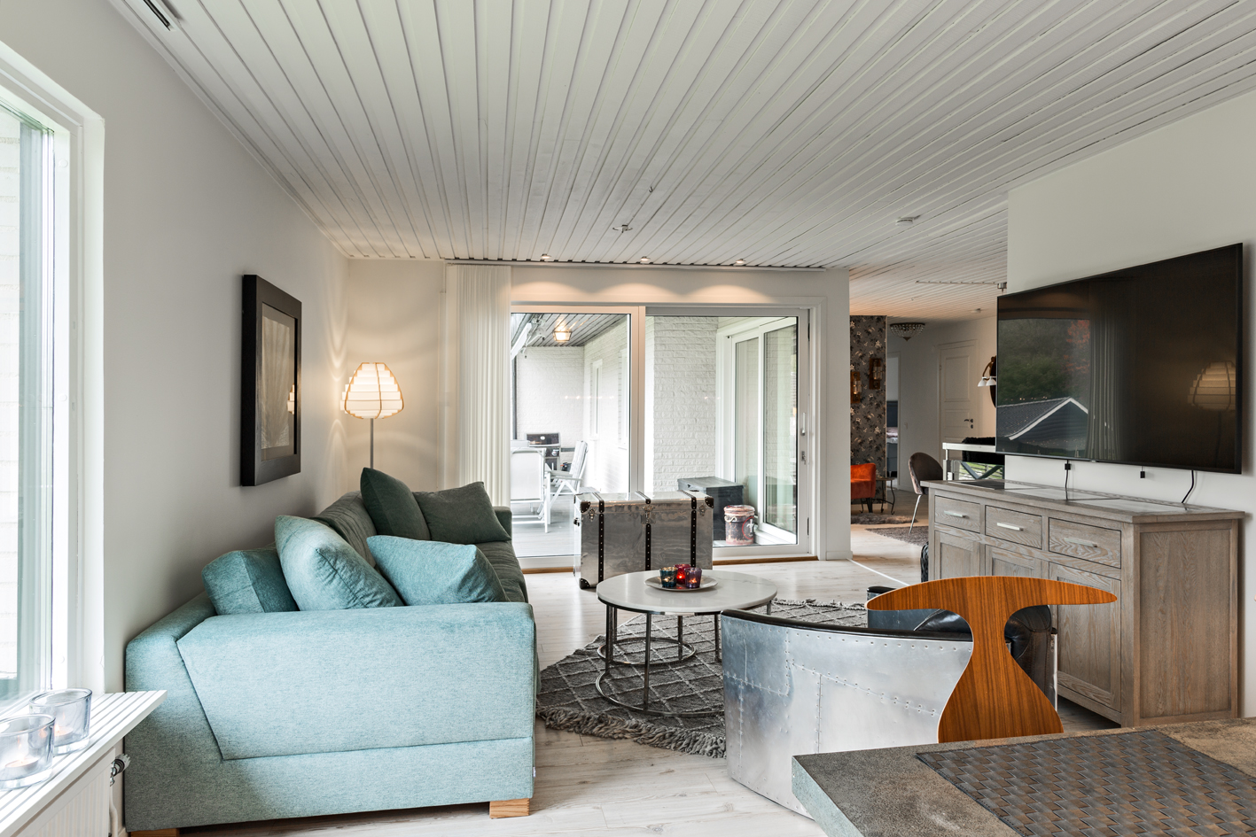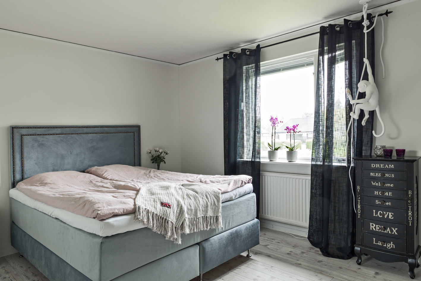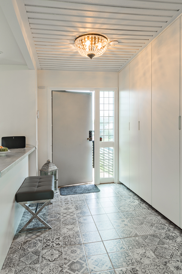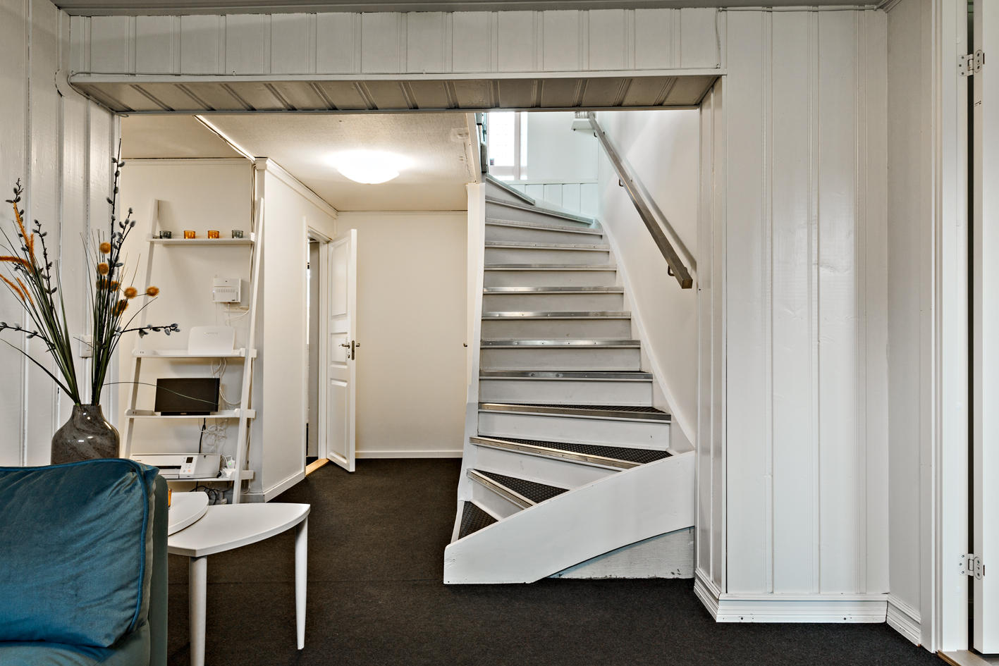 Från parkeringen på uppfarten framför huset eller i garaget har vi nära till entrétrappan och hallen. Här ligger ett snyggt och på samma gång tåligt klinkergolv och gott om plats för förvaring finns i garderoberna på vänster sida innanför dörren. Köket, hallen och vardagsrummet bildar tillsammans en öppen planlösning med stora sällskapsytor. Den vita stilrena inredningen har släta luckor och lådfronter med infällda handtag. De rostfria vitvarorna från Siemens och Bosch består av induktionshäll, varmluftsugn, fläkt, micro, integrerad diskmaskin samt kyl/frys av kombimodell. Tålig marmormönstrad bänkskiva matchas däröver med ett matchande klinker som stänkskydd. Matplatsen är centralt placerad och härifrån nås enkelt den stora altanen utanför, eller vardagsrummet och kök. Ett ljust golv löper genom husets alla rum såväl uppe som nere. Vardagsrummet är stort med plats för både soffgrupp som matsalsgrupp. Även från detta rum kommer vi via skjutdörrar ut till baksidans rymliga altan och trädgården nedanför. Altanen är delvis skyddad under tak och vid behov finns en stor markis som skyddar resten av altanen. Hallen leder från köket bort mot våningsplanets 3 sovrum. Sovrum 1 ligger direkt på vänster hand och härifrån har vi utsikt över trädgården och altanen på husets baksida. Plats för säng och klädförvaring. Sovrum 2 är väl tilltaget och har plats för såväl säng som för skrivbord och fåtölj. Härifrån kommer vi även vidare ut till altanen genom en ny altandörr. Målade väggar samt heltäckningsmatta gör rummet ombonat. Gott om plats för klädförvaring bakom spegelskjutdörrar i 3 garderober.Våningens tredje sovrum är rymligt och har plats för dubbelsäng. Här finns även gott om väggfasta garderober med gott om förvaringsutrymme. Badrummet ligger i anslutning till sovrummen. Detta har våtrumsmatta och kakel på väggarna. Fräsch inredning med badkar, handfat samt toalett. Från hallen tar vi trappan ner till källarplanet. Ett nytt räcke och handtag i rostfritt och glas ger bra ljusinsläpp mellan våningarna och bidrar till den öppna planlösningen.