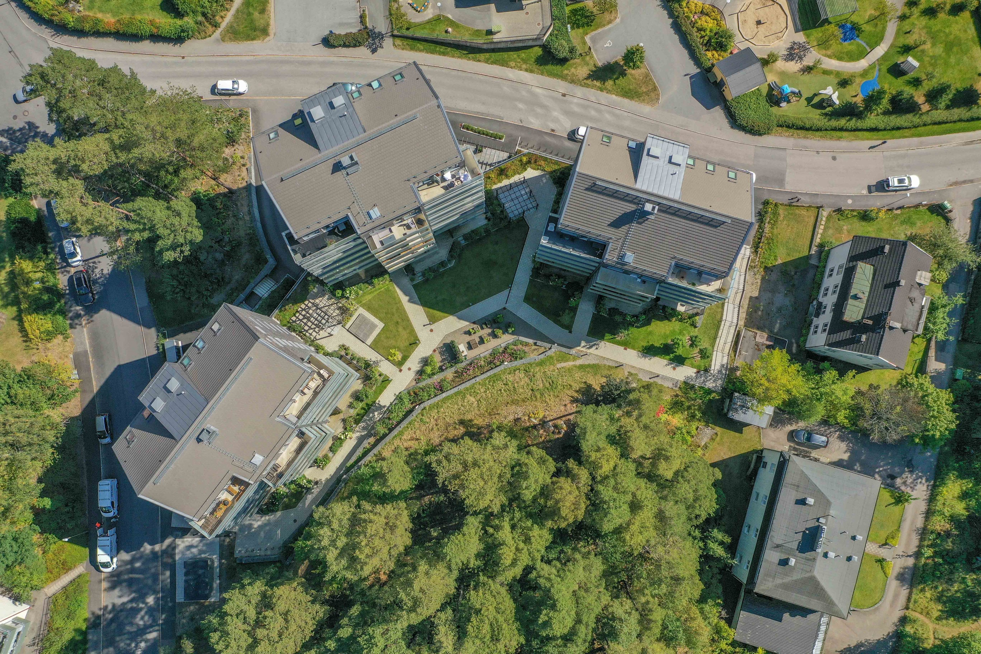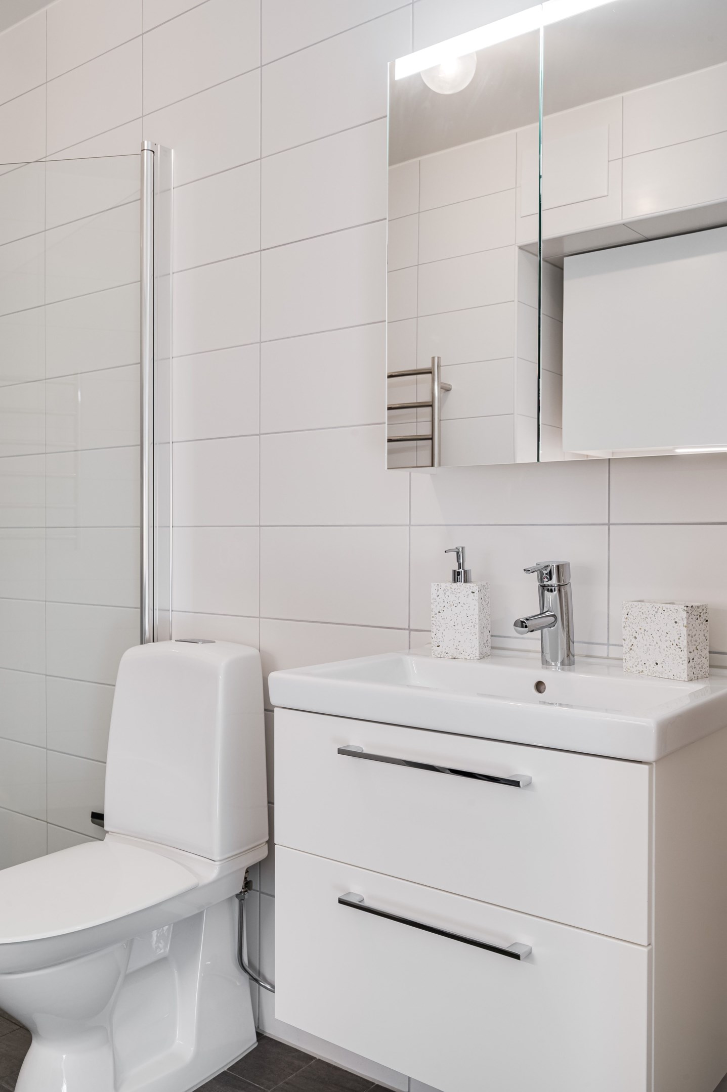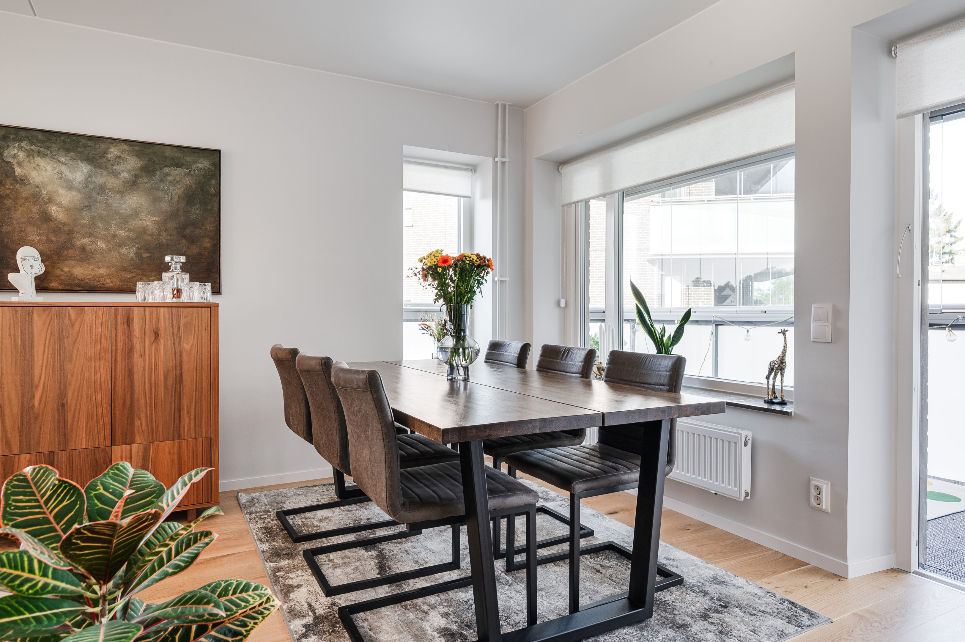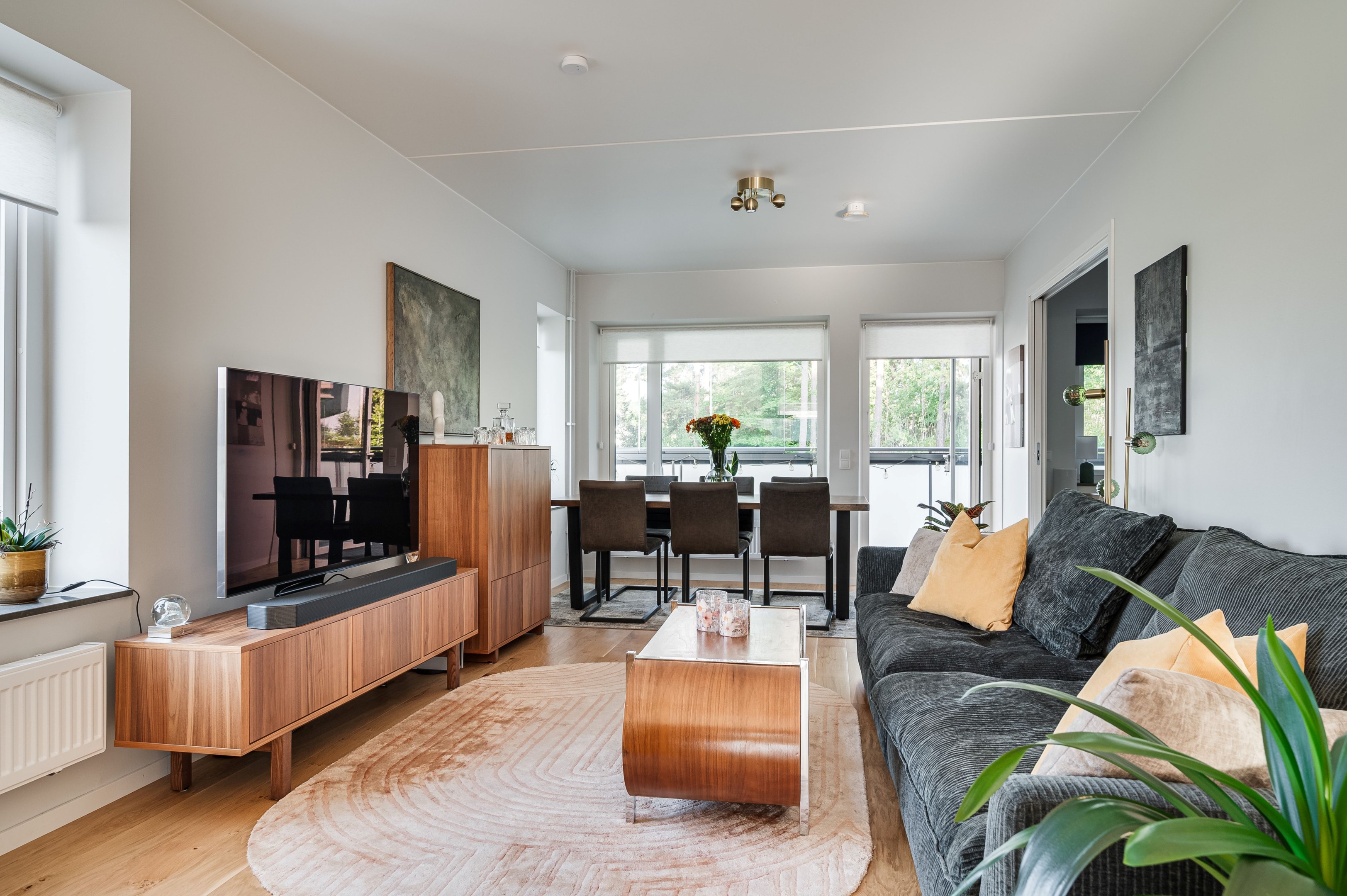 Kök – stilrent och socialt Hemmet öppnar upp med ett modernt kök i vitt med släta luckor, svarta beslag och arbetsyta i ljus marmorinspirerad laminat. Ett elegant stänkskydd binder ihop helheten. Vitvarorna från Electrolux erbjuder hög standard: hel kyl och frys, inbyggd mikro och ugn, induktionshäll samt fläkt i rostfritt. Den öppna bardelen mot vardagsrummet skapar en social och praktisk mötesplats – perfekt för både vardagsfrukostar och mingel med vänner. Vardagsrum – hemmets hjärta Det luftiga vardagsrummet erbjuder plats för både matgrupp och soffhörna. Ljuset strömmar in genom stora fönsterpartier och förstärker den rymliga känslan. Härifrån nås bostadens inglasade balkong i soligt sydvästläge – en extra oas för middagar, avkoppling eller odling. Tre sovrum & gott om förvaring Bostaden rymmer tre trivsamma sovrum, varav master bedroom har tillgång till egen klädkammare. De övriga sovrummen fungerar lika bra som barnrum, gästrum eller kontor. Samtliga rum har ljusa väggar och ekparkettgolv, vilket ger en enhetlig och harmonisk känsla. Utöver klädkammaren finns ytterligare en walk-in samt flera garderober – perfekt för familjeliv. Badrum & gästtoalett Det helkaklade badrummet är fräscht och funktionellt, med vita kakelväggar, ljusgrå klinker och duschhörna med glasväggar. Här finns tvättmaskin och torktumlare från Electrolux, arbetsbänk och väggskåp – en praktisk tvättdel som gör vardagen smidigare. Därtill finns en separat gästtoalett i samma ljusa stil.
