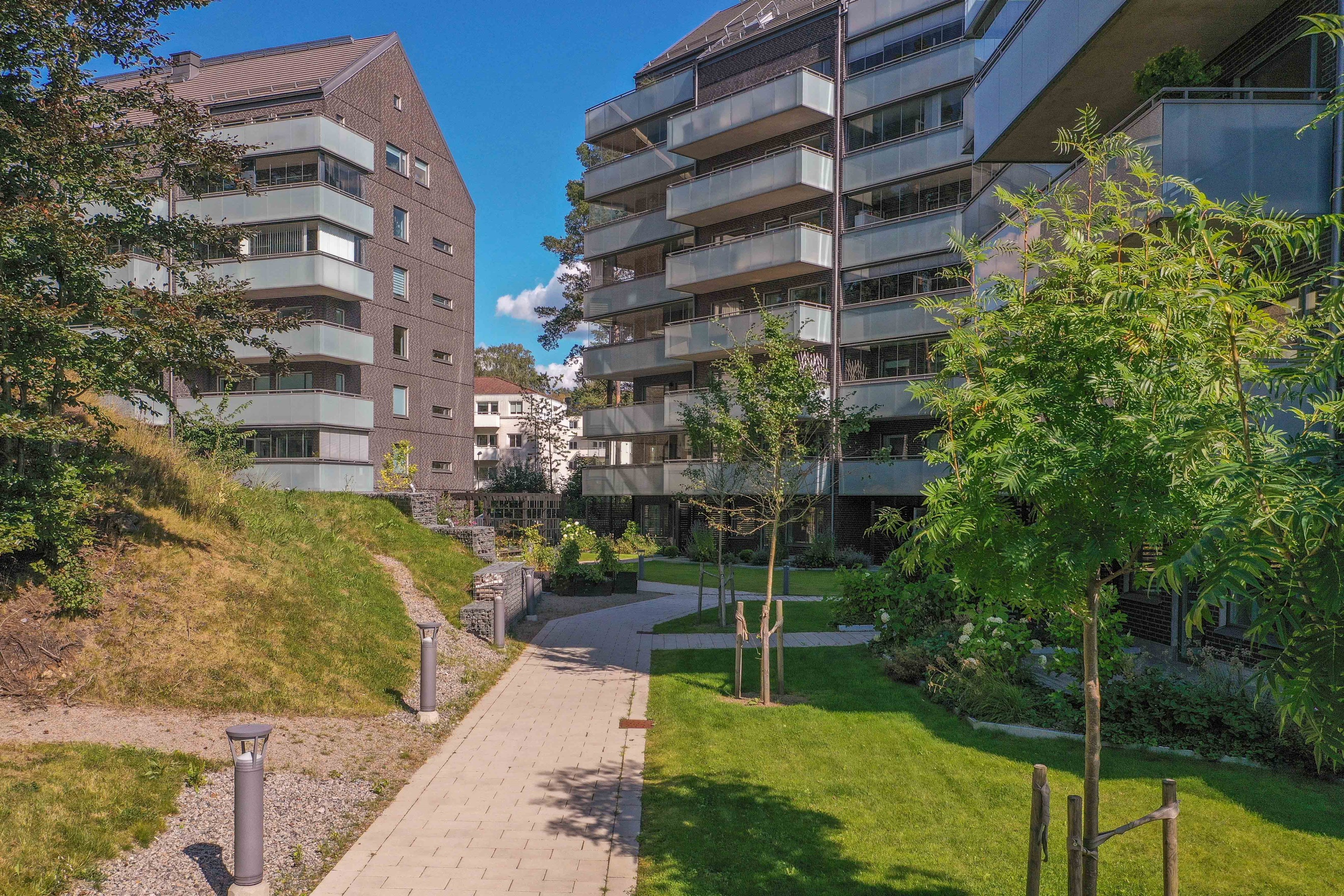 Modern fyrarummare med inglasad balkong, stilrent kök och påkostade materialval