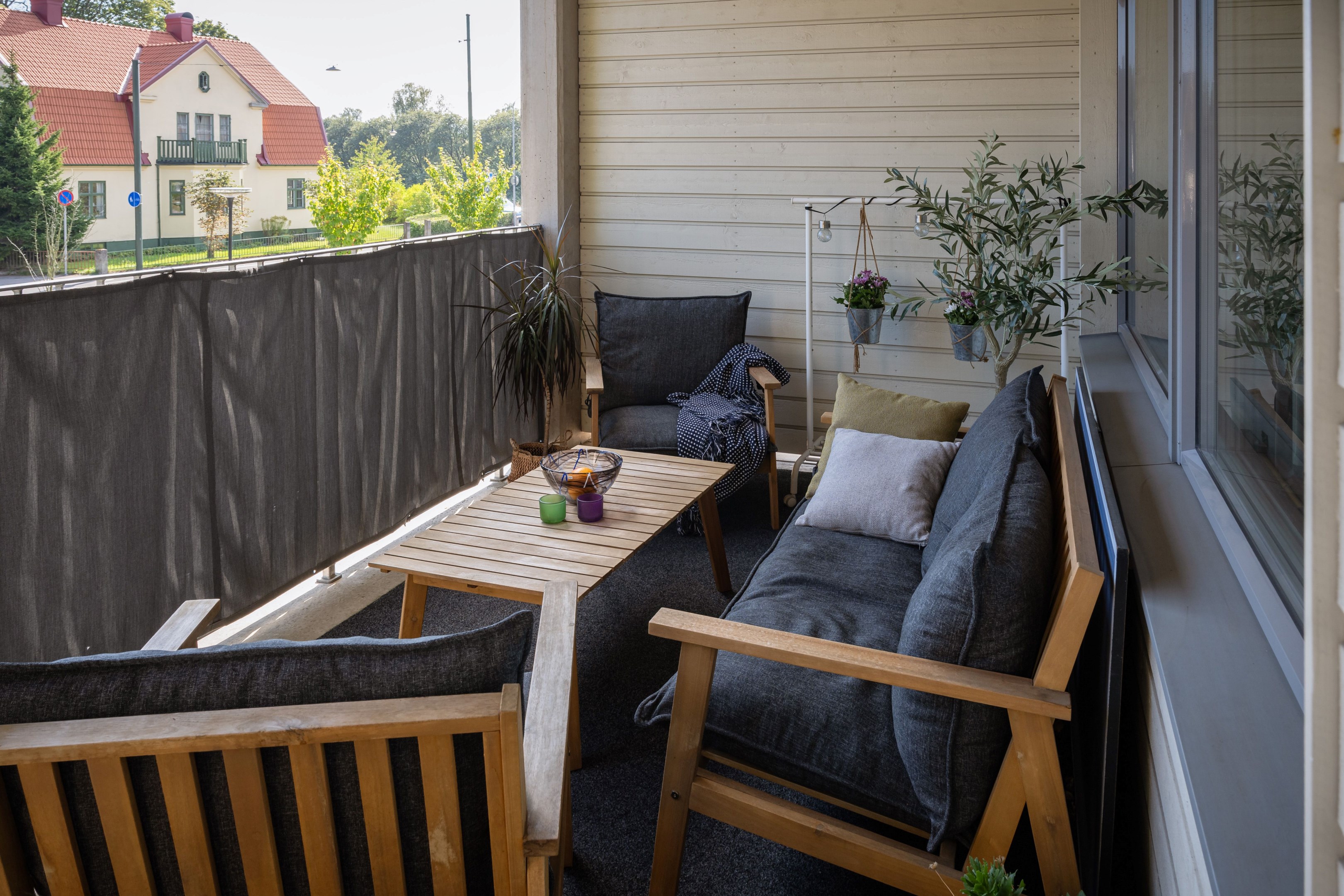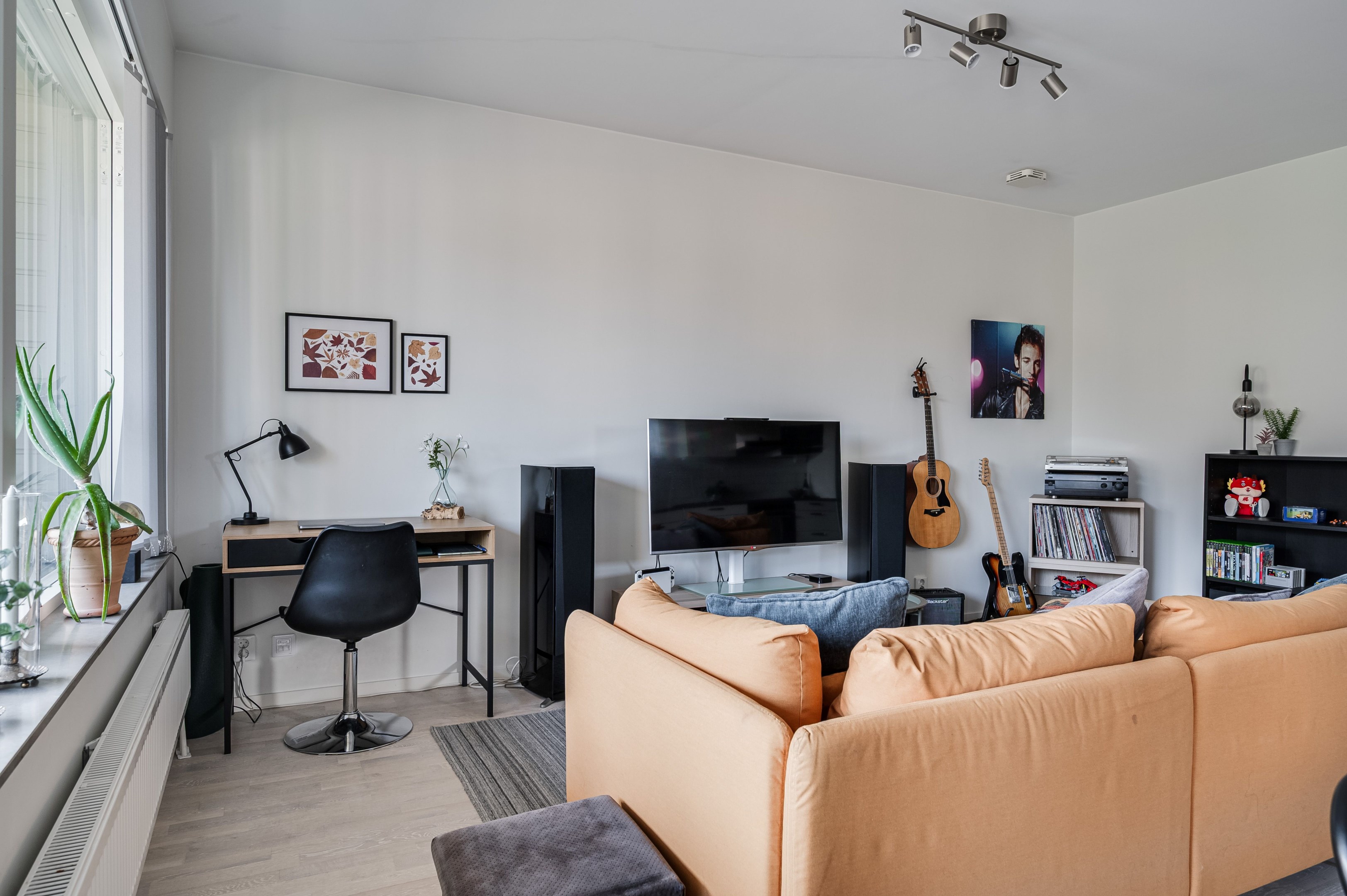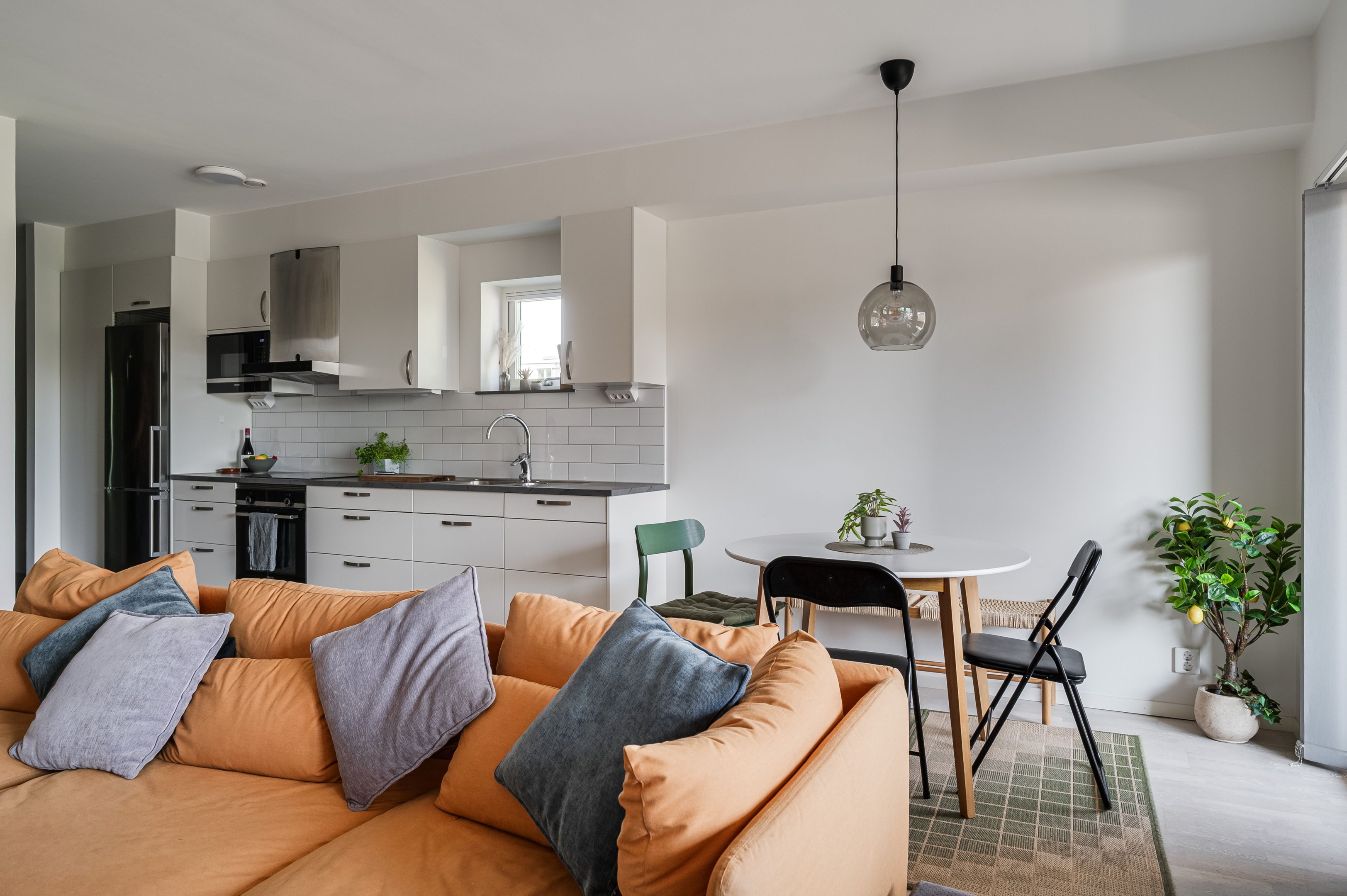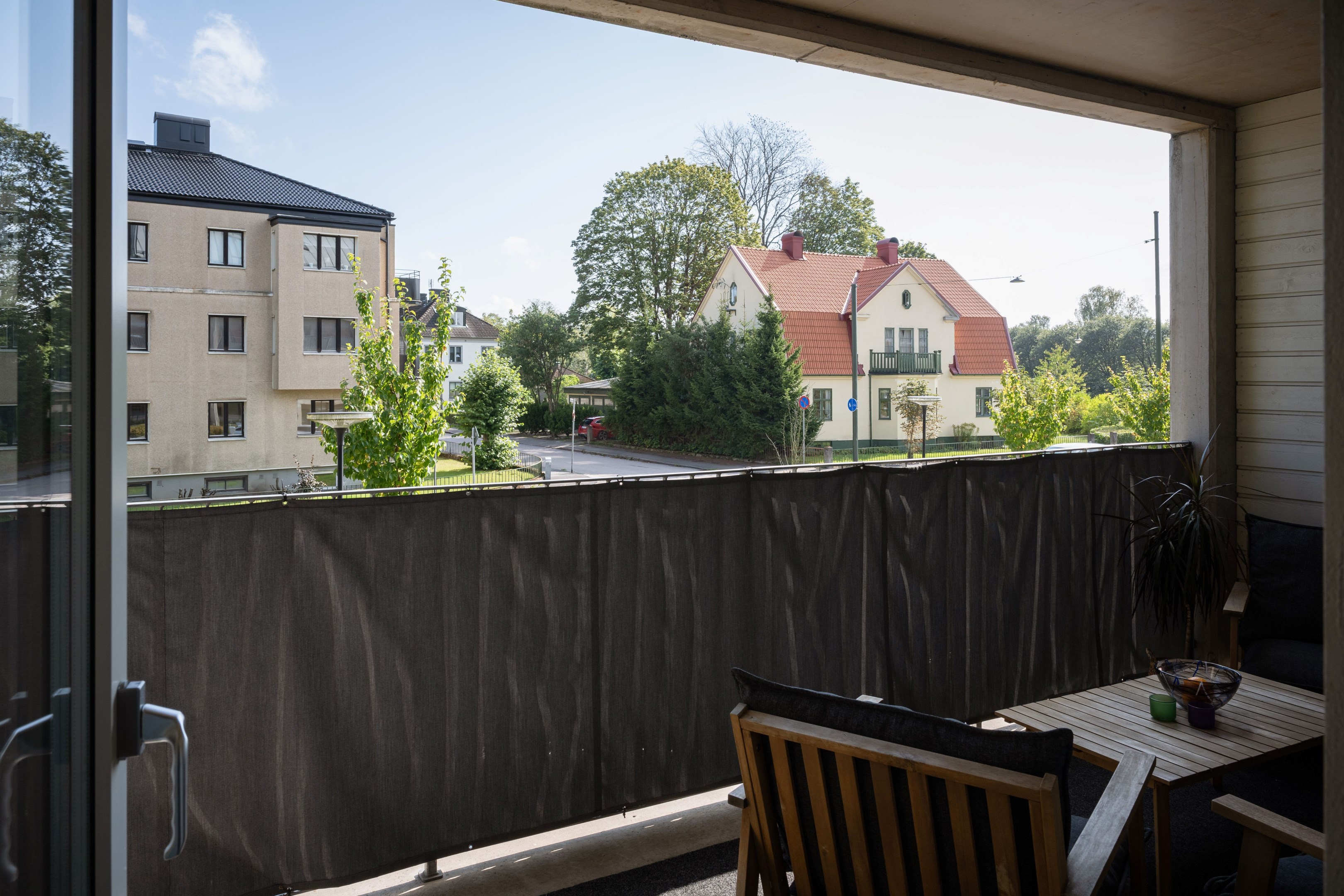Redan i hallen möts du av en ljus och välkomnande känsla. Här finns gott om plats för ytterkläder och förvaring i inbyggda garderober. Det praktiska klinkergolvet vid entrén övergår längre in i bostaden till ett stiligt parkettgolv i vitlaserad ek som löper vidare genom rummen. Kök och vardagsrum Den öppna planlösningen mellan kök och vardagsrum skapar en social och inbjudande yta. Köket går i modern stil med vita släta luckor, påkostade vitvaror från Siemens och en stilren bänkskiva som kompletteras av ett klassiskt vitt kakel. Här finns gott om arbetsyta och förvaring. Intill köket ryms en naturlig matplats vid fönstret, perfekt för vardagens middagar såväl som helgens middagsbjudningar med vänner. Vardagsrummet erbjuder en generös yta för soffgrupp, tv-möbel och även en arbetsplats för den som jobbar hemifrån. De stora fönsterpartierna släpper in rikligt med ljus och ger rummet en härlig rymd. Balkong Från vardagsrummet nås den stora balkongen, en given favoritplats under årets varmare månader. Här finns plats för både loungegrupp och matbord, perfekt för avkoppling, balkonghäng med vänner eller middagar i sommarvärmen. Sovrummet är rofyllt och välplanerat med plats för dubbelsäng och sängbord. Här finns även garderober som ger bra förvaringsmöjligheter. Badrum Det helkaklade badrummet håller hög standard med stilren inredning i grått och vitt. Här finns både golvvärme och egen tvättavdelning med tvättmaskin och torktumlare samt en praktisk arbetsbänk och överskåp för förvaring. Till bostaden hör två stycken förråd varav ett precis utanför ytterdörren. Med sitt läge på gaveln blir utrymmet i anslutning till entrén som en egen privat del av loftgången där man kan avnjuta en kopp kaffe i morgonsolen.
