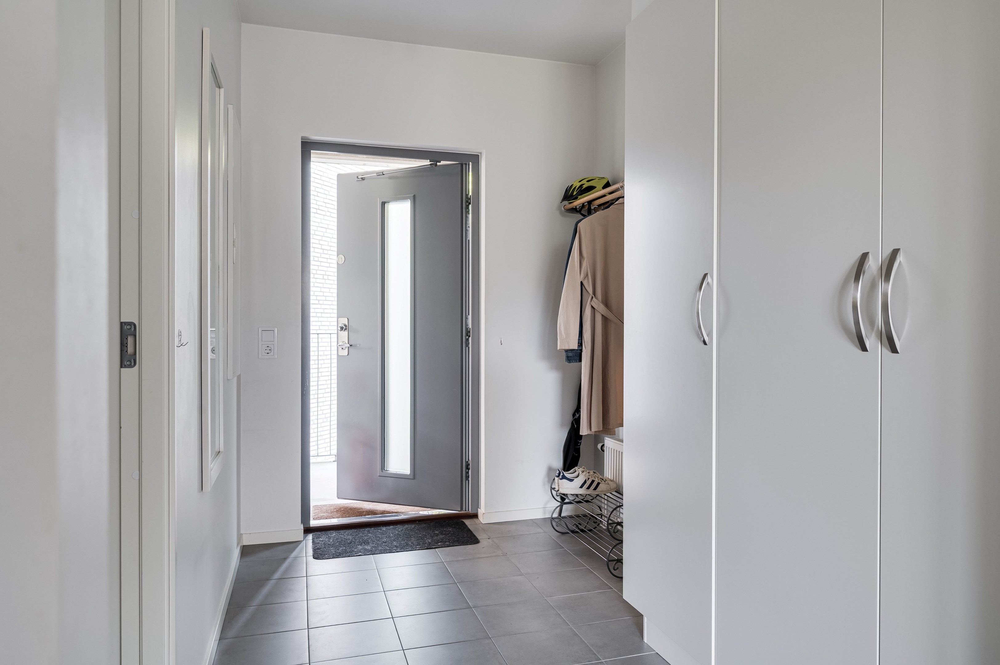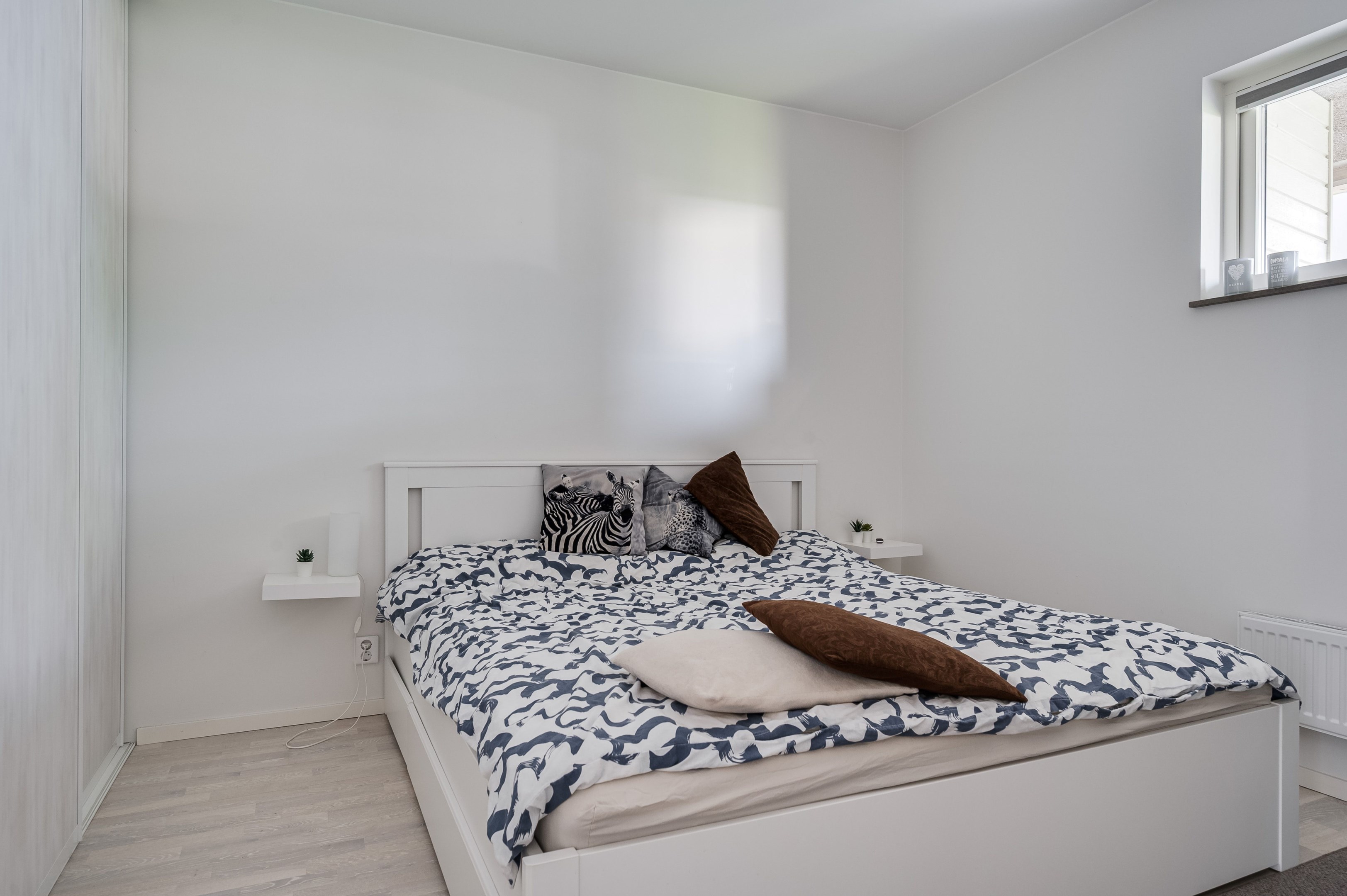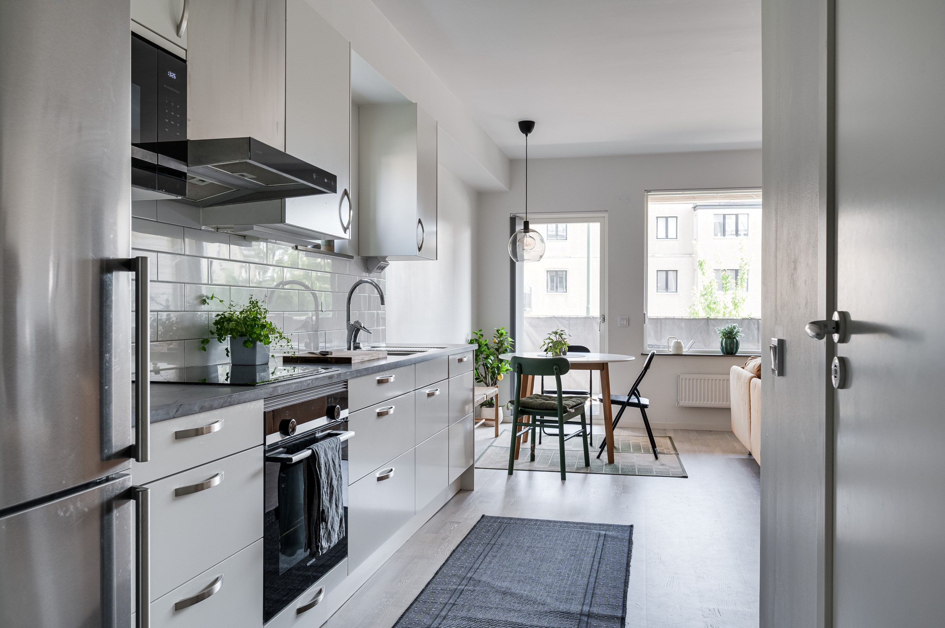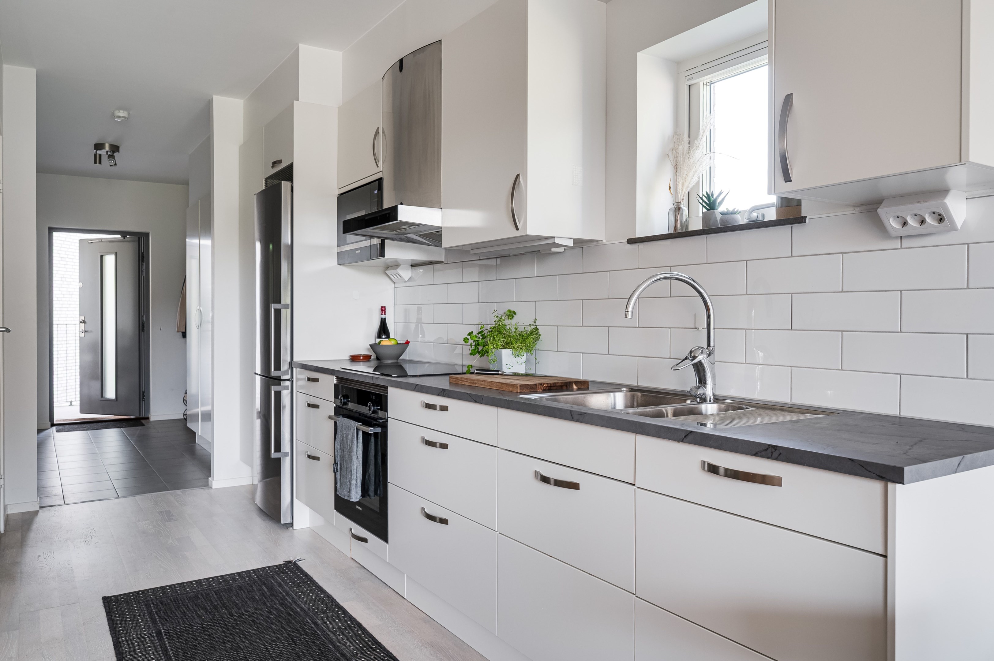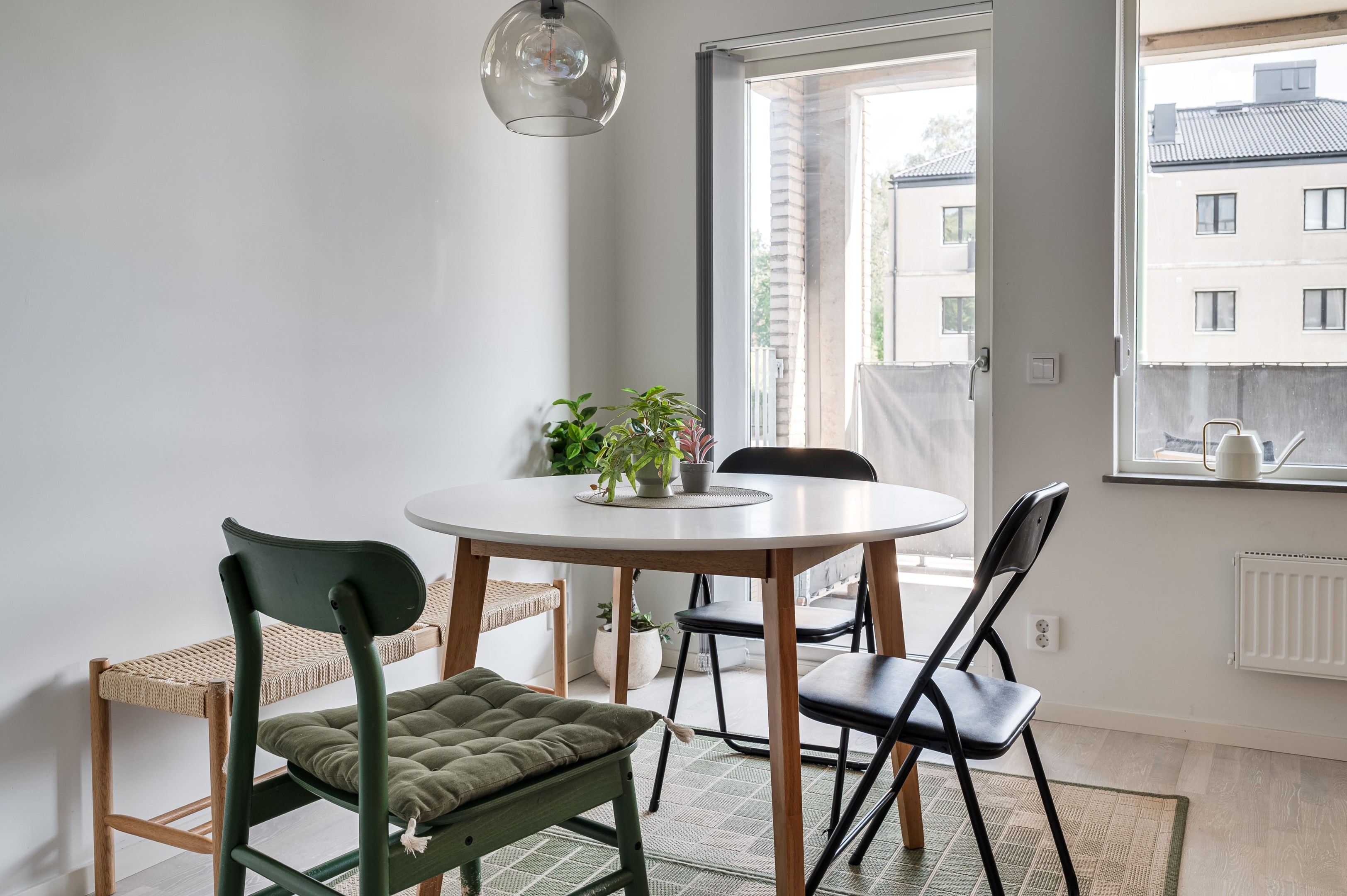 Redan i hallen möts du av en ljus och välkomnande känsla. Här finns gott om plats för ytterkläder och förvaring i inbyggda garderober. Det praktiska klinkergolvet vid entrén övergår längre in i bostaden till ett stiligt parkettgolv i vitlaserad ek som löper vidare genom rummen. Kök och vardagsrum Den öppna planlösningen mellan kök och vardagsrum skapar en social och inbjudande yta. Köket går i modern stil med vita släta luckor, påkostade vitvaror från Siemens och en stilren bänkskiva som kompletteras av ett klassiskt vitt kakel. Här finns gott om arbetsyta och förvaring. Intill köket ryms en naturlig matplats vid fönstret, perfekt för vardagens middagar såväl som helgens middagsbjudningar med vänner. Vardagsrummet erbjuder en generös yta för soffgrupp, tv-möbel och även en arbetsplats för den som jobbar hemifrån. De stora fönsterpartierna släpper in rikligt med ljus och ger rummet en härlig rymd. Balkong Från vardagsrummet nås den stora balkongen, en given favoritplats under årets varmare månader. Här finns plats för både loungegrupp och matbord, perfekt för avkoppling, balkonghäng med vänner eller middagar i sommarvärmen. Sovrummet är rofyllt och välplanerat med plats för dubbelsäng och sängbord. Här finns även garderober som ger bra förvaringsmöjligheter. Badrum Det helkaklade badrummet håller hög standard med stilren inredning i grått och vitt. Här finns både golvvärme och egen tvättavdelning med tvättmaskin och torktumlare samt en praktisk arbetsbänk och överskåp för förvaring. Till bostaden hör två stycken förråd varav ett precis utanför ytterdörren. Med sitt läge på gaveln blir utrymmet i anslutning till entrén som en egen privat del av loftgången där man kan avnjuta en kopp kaffe i morgonsolen.