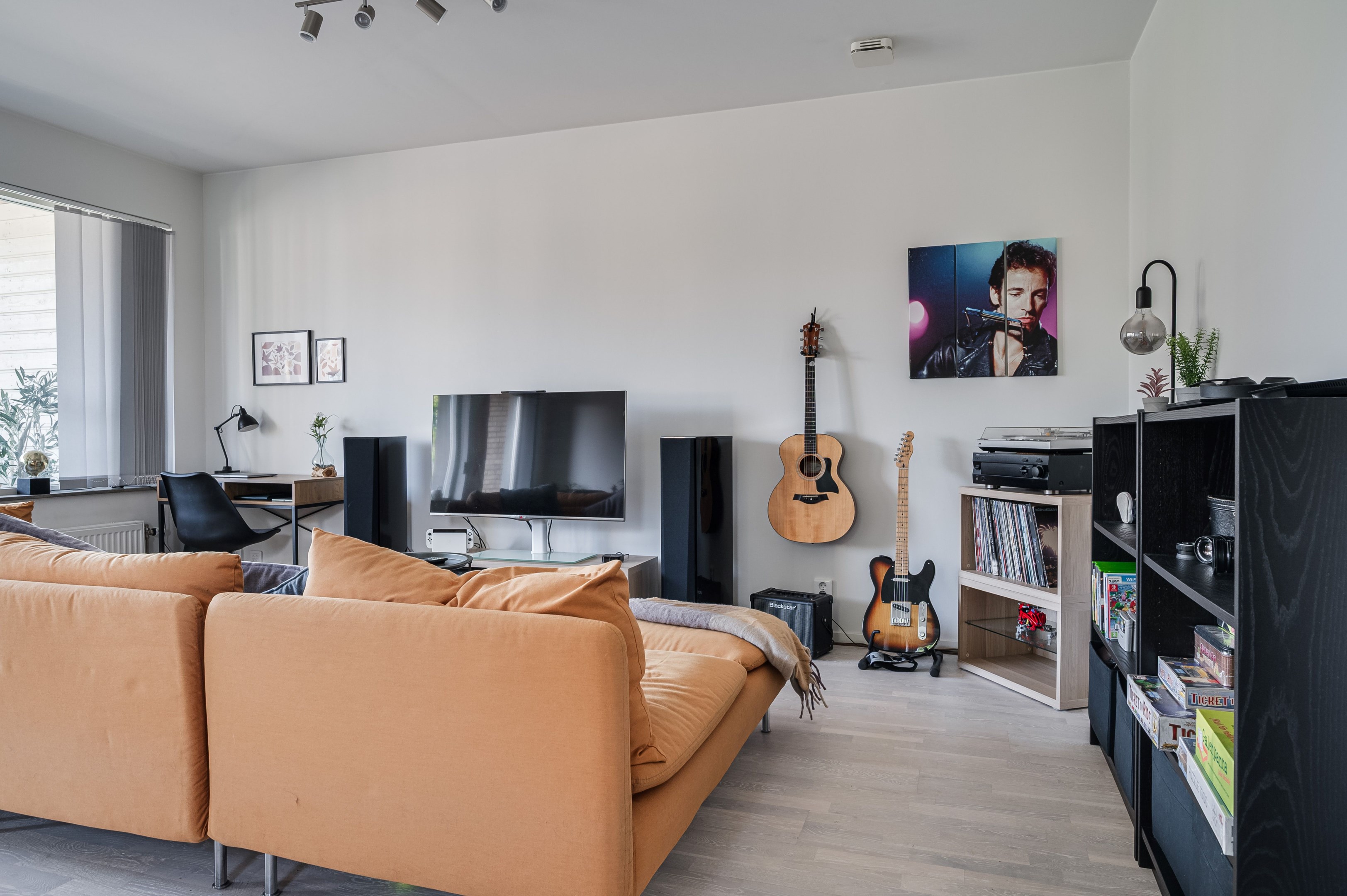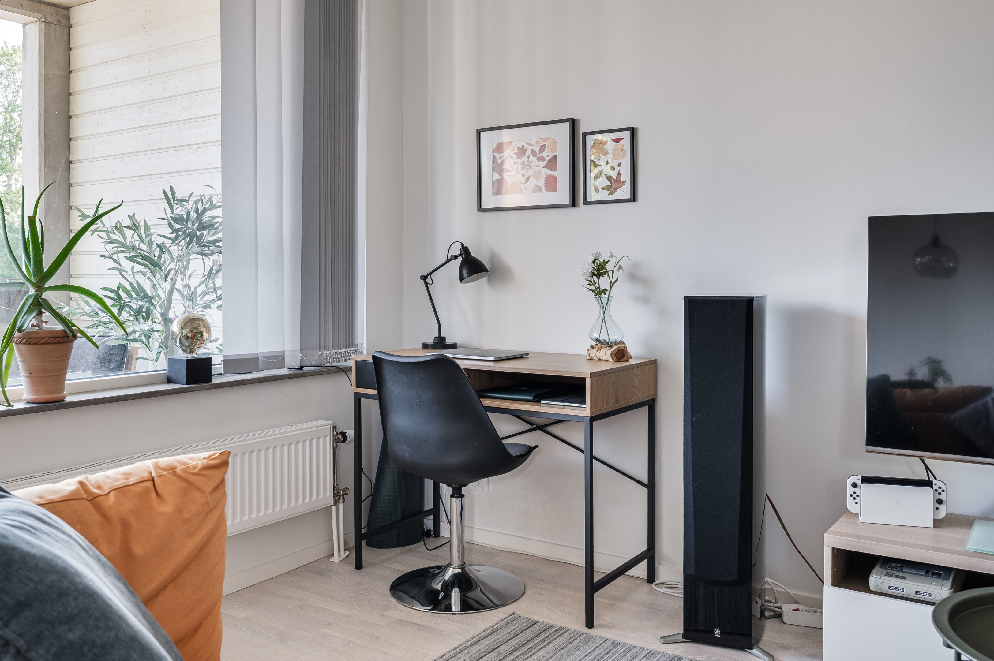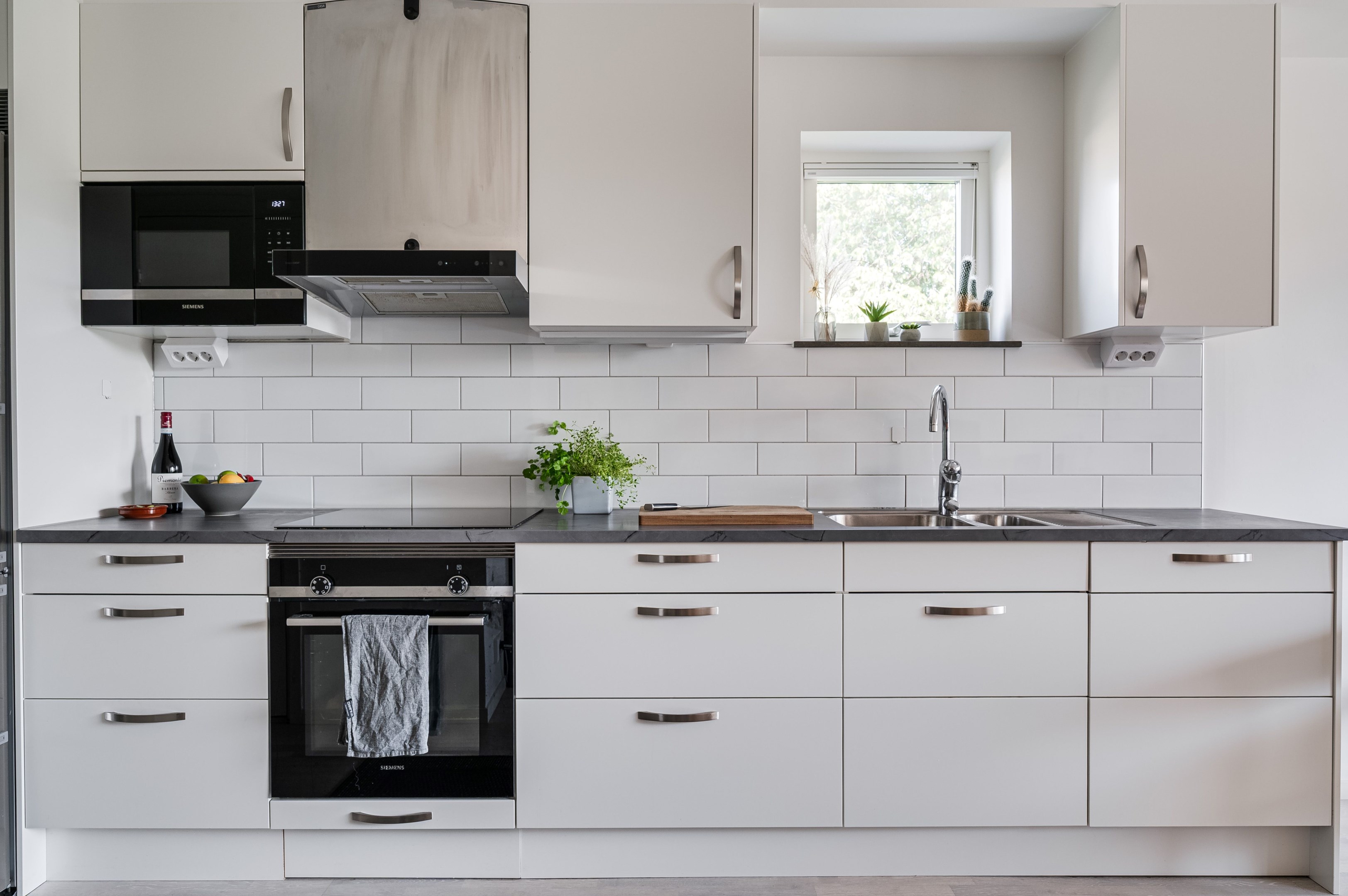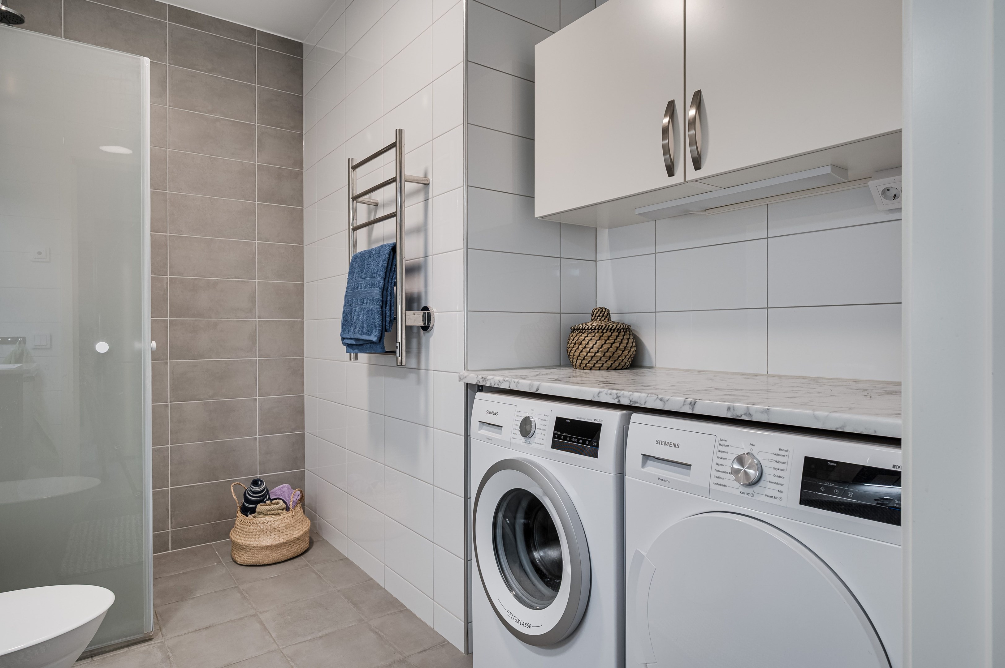 Redan i hallen möts du av en ljus och välkomnande känsla. Här finns gott om plats för ytterkläder och förvaring i inbyggda garderober. Det praktiska klinkergolvet vid entrén övergår längre in i bostaden till ett stiligt parkettgolv i vitlaserad ek som löper vidare genom rummen. Kök och vardagsrum Den öppna planlösningen mellan kök och vardagsrum skapar en social och inbjudande yta. Köket går i modern stil med vita släta luckor, påkostade vitvaror från Siemens och en stilren bänkskiva som kompletteras av ett klassiskt vitt kakel. Här finns gott om arbetsyta och förvaring. Intill köket ryms en naturlig matplats vid fönstret, perfekt för vardagens middagar såväl som helgens middagsbjudningar med vänner. Vardagsrummet erbjuder en generös yta för soffgrupp, tv-möbel och även en arbetsplats för den som jobbar hemifrån. De stora fönsterpartierna släpper in rikligt med ljus och ger rummet en härlig rymd. Balkong Från vardagsrummet nås den stora balkongen, en given favoritplats under årets varmare månader. Här finns plats för både loungegrupp och matbord, perfekt för avkoppling, balkonghäng med vänner eller middagar i sommarvärmen. Sovrummet är rofyllt och välplanerat med plats för dubbelsäng och sängbord. Här finns även garderober som ger bra förvaringsmöjligheter. Badrum Det helkaklade badrummet håller hög standard med stilren inredning i grått och vitt. Här finns både golvvärme och egen tvättavdelning med tvättmaskin och torktumlare samt en praktisk arbetsbänk och överskåp för förvaring. Till bostaden hör två stycken förråd varav ett precis utanför ytterdörren. Med sitt läge på gaveln blir utrymmet i anslutning till entrén som en egen privat del av loftgången där man kan avnjuta en kopp kaffe i morgonsolen.